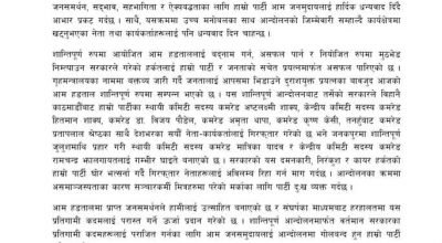 आजको आमहड्ताल सफल भएको भन्दै केन्द्रीय संघर्ष समितिका संयोजक तथा पार्टी प्रवक्ता नारायणकाजी श्रेष्ठले विज्ञप्ति जारी गरेका छन् ।