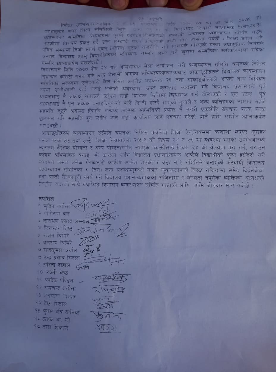 विद्यालयका प्रधानाध्यापकले हुदै नभएको अभिभावकलाइ अभिभावक भएको देखाउँन विद्यार्थीको कृर्ते हाजिर समेत गराउने गरेको विज्ञप्तिमा भनिएको छ । यसैगरी हेटौडा उपमहानगरपालिका २ नं. वडा कार्यालयले अहिले बनाएको अस्थायी विद्यालय व्यवस्थापन समितिका ३ जना सदस्यले राजिनामा दिएका छन् । ‘गलत क्रियाकलापमा संलग्न विद्यालयका प्रअको राजिनामा र योग्यता नपुगेका व्यक्तिलाइ गरिएको अध्यक्षको नियुक्ती बदरको गरी यथाशीघ्र विद्यालय व्यवस्थापन समिति गठनको लागि हामी जोडदार माग गर्दछौ’ विज्ञप्तिमा भनिएको छ ।