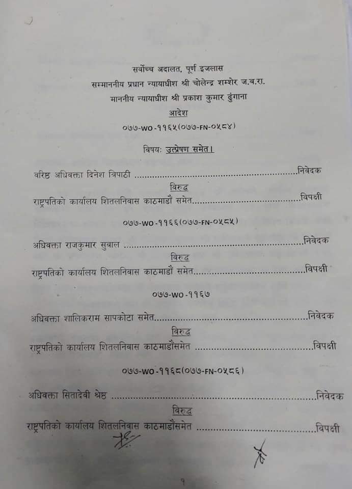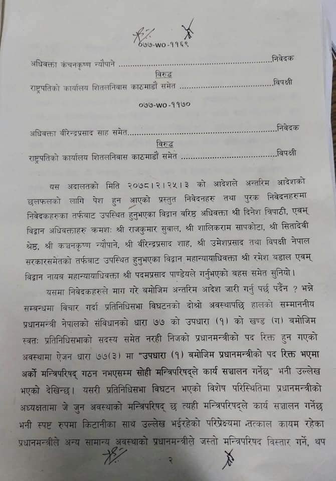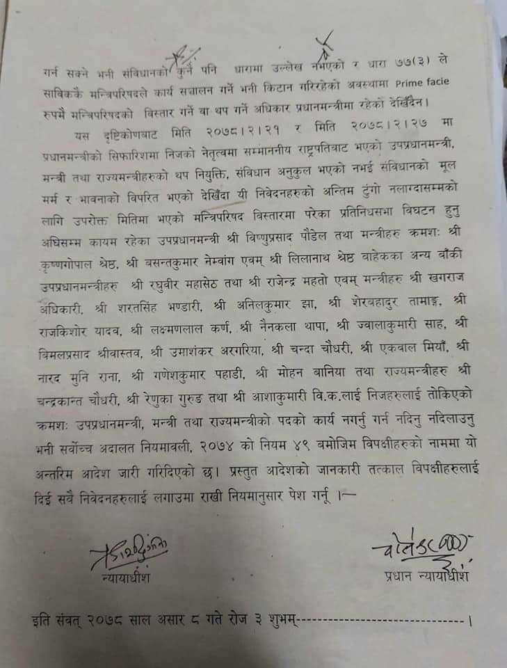 ‘२०७८ साल जेठ २१ र २७ मा प्रधानमन्त्रीको सिफारिसमा सम्माननीय राष्ट्रपतिबाट भएको उपप्रधानमन्त्री एवं मन्त्रीहरूको सपथ र कार्यविभाजन संविधान अनुकुल भएको नभई संविधानको मूल मर्म भावना विपरीत भएकोले निवेदनको अन्तिम किनारा नलागेसम्मका लागि मन्त्रिपरिषद विस्तारको निर्णय कार्यान्वयन नगर्न’ आदेशमा उल्लेख छ ।