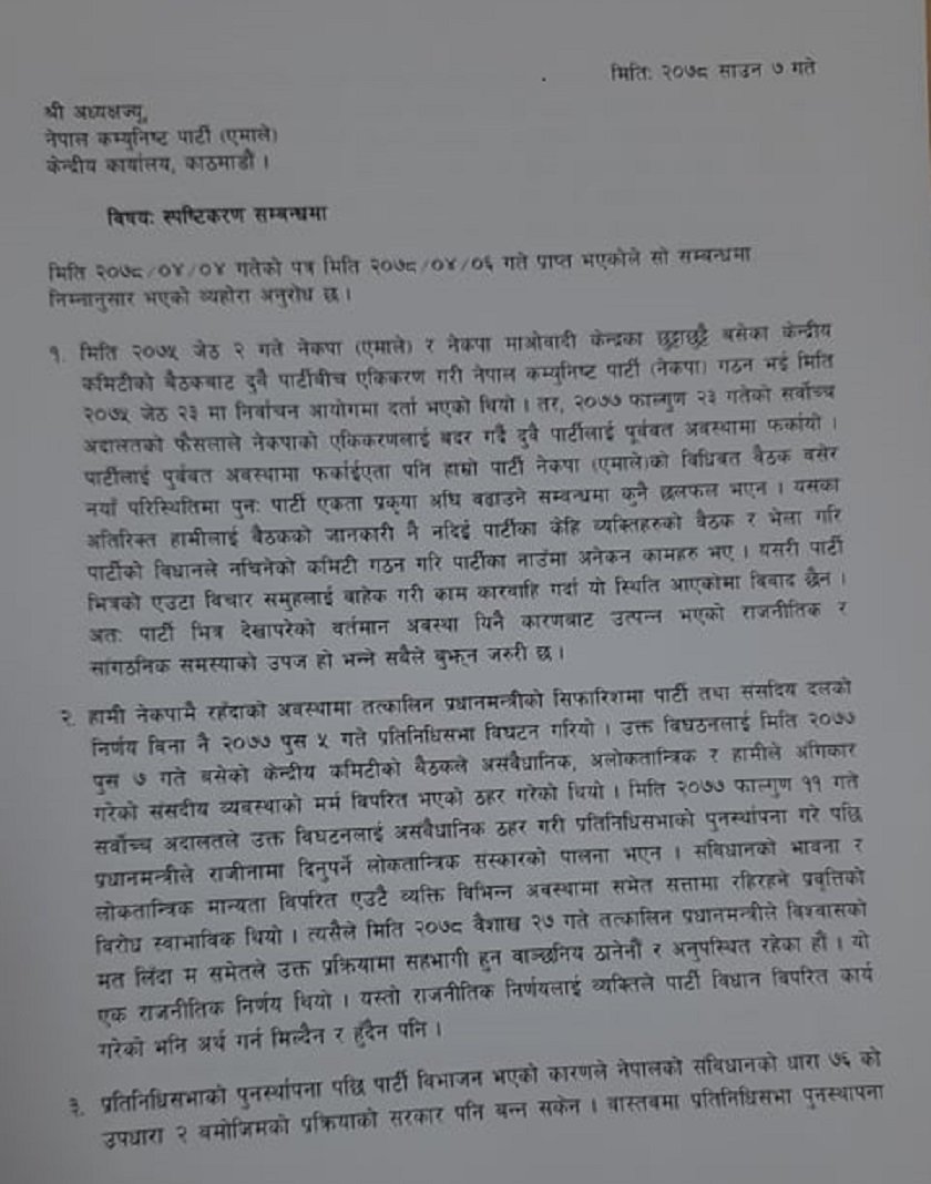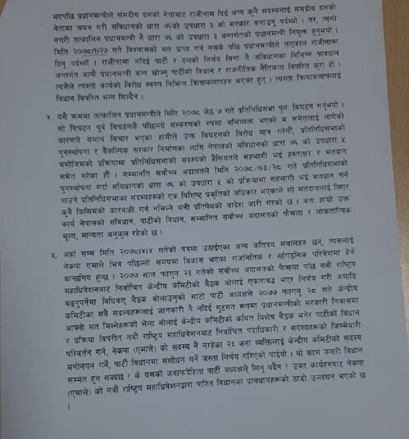 पत्रमा २३ फागुनको सर्वोच्चको निर्णयको पालना गरेको नवौं महाविशेनबाट निर्वाचित केन्द्रीय कमिटीको बैठक बोलाउनु पथ्र्यो तर त्यसको विपरित अध्यक्ष ओलीले बैठक नबोलाएको आरोप स्पष्टीकरण पत्रमा लगाइएको छ। भनिएको छ, ‘ २०७७ साल २३ फागुनको सर्वोच्च अदालतको फैसला पछि नवौ राष्टिय महाविधेशनबाट निर्वाचित केन्द्रीय कमिटीको बैठक बोलाइ एकताबद्ध भएर निर्णगरी अगाडि बढ्नुपर्नेमा विधिवत बैठक बोलाउनुको साटो पार्टी अध्यक्षले २८ गते पार्टी कमिटीलाई जानकारी नदिए गुटगत रुपमा प्रधानमन्त्रीको सरकारी निवासमा आफ्नो मत मिल्नेहरुको भेला बोलाइ…….विधान र प्रक्रिया विपरित पार्टी पदाधिकारी र केन्द्रीय सदस्यको जिममेवारी परिवर्तन गर्ने र पार्टीबाट निकाल्ने काम भयो ।’