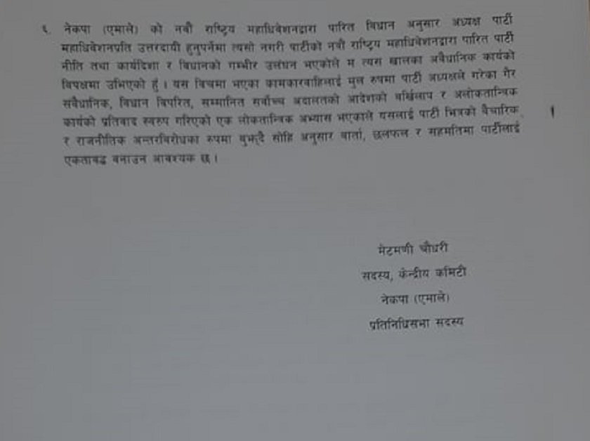 अध्यक्ष केपी शर्मा ओलीलाई सम्बोधन गरेर पठाइएको जवाफमा पहिलो पटक प्रतिनिधिसभा पुनःस्थापना भएपछि ओलीले संसदीय दलको नेताबाट राजीनामा दिनुपर्नेमा नदिएपछि आफुले संसदमा विश्वासको मत दिन आवश्यक नठानेको सांसद मेटमणी चौधरीले जवाफमा उल्लेख गरेका छन् ।