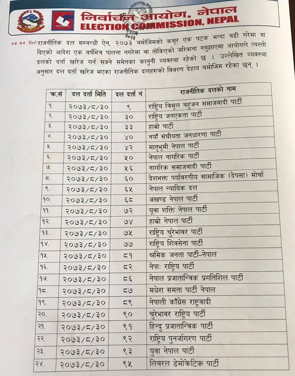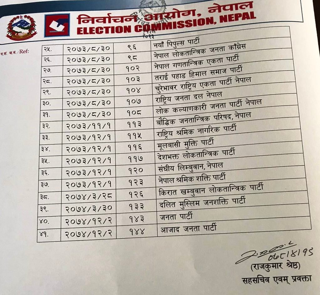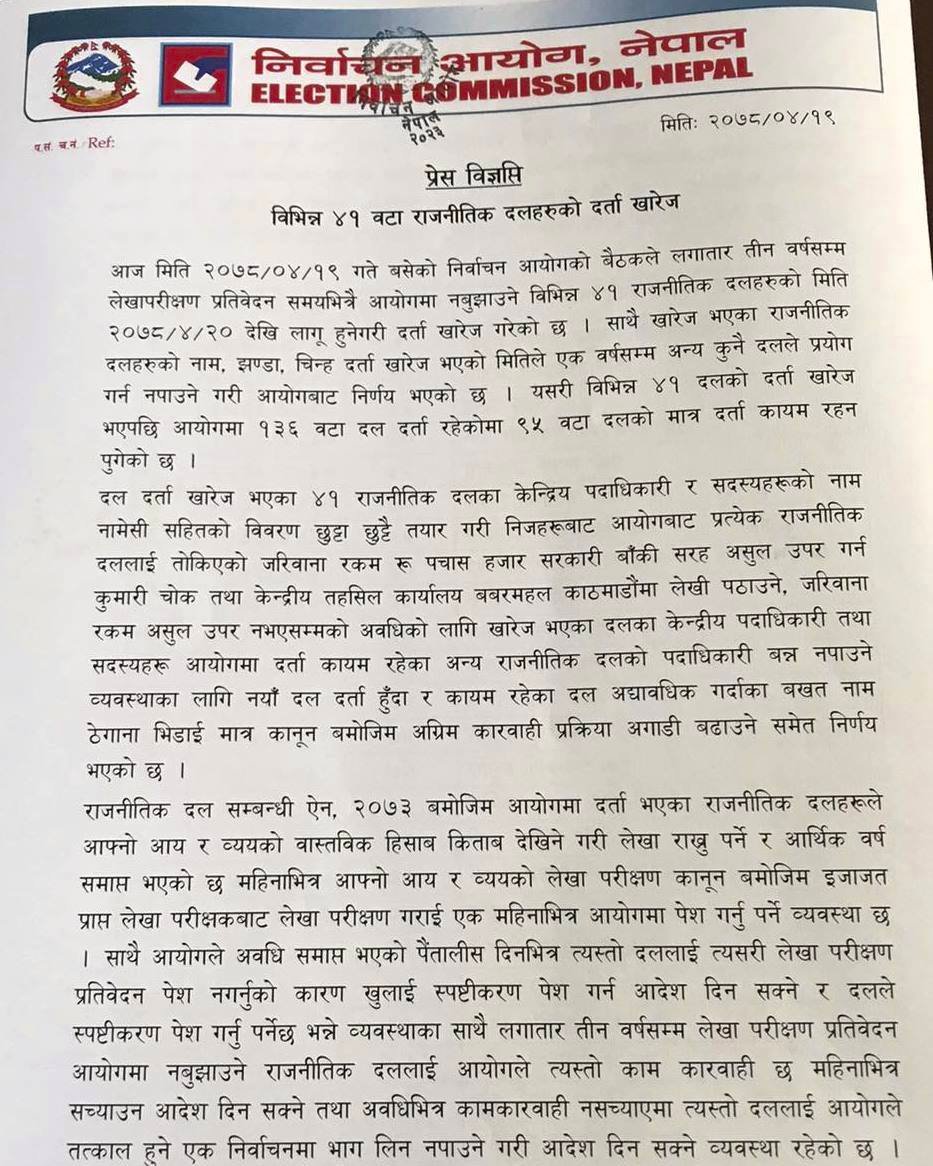 ४१ वटा राजनीतिक दलको दर्ता खारेज (सूचीसहित)