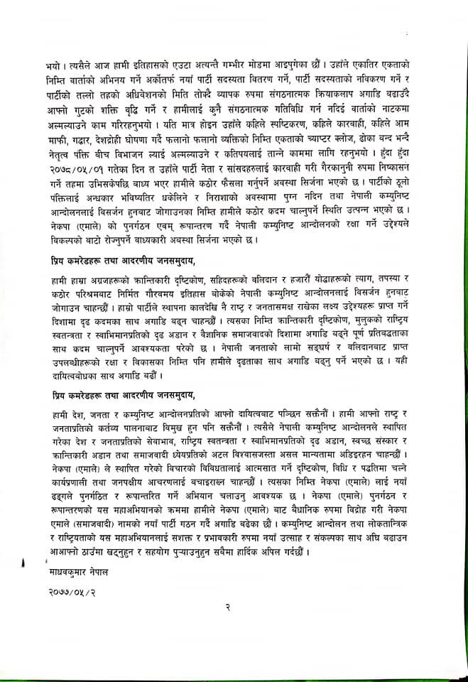 उनले भनेका छन् ‘नेपाली कम्युनिष्ट आन्दोलनलाई विसर्जन हुनबाट जोगाउनका निम्ति कठोर कदम चाल्नुपरेको हो। नेकपा एमाले पुनर्गठन र रुपान्तरणको सिलसिलामा वैधानिक विद्रोह गरी नयाँ पार्टी जन्माएको हो ।’
