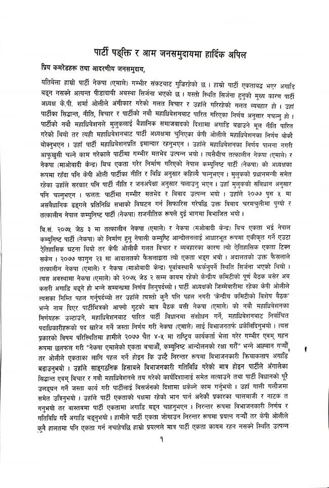 उनले भनेका छन् ‘हामी देश, जनता र कम्युनिस्ट आन्दोलनप्रतिको आफ्नो दायीत्वबाट पन्छिन सक्तैनौ । हामी आफ्नो राष्ट्र र जनताप्रतिको कतव्र्य पालनाबाट विमुख हुन पनि सक्तैनौ । त्यसैले नेपाली कम्युनिस्ट आन्दोलनले स्थापित गरेको देश र जनताप्रतिको सेवाभाव , राष्ट्रिय स्वतन्त्रता र स्वाभीमानप्रतिको दृढ अडान, स्वच्छ सस्कार र क्रान्तिकारी अडान तथा समाजवादी ध्येयप्रतिको अटल विश्वासजस्ता असल मान्यतामा अडिइरहन चाहन्छौ ।