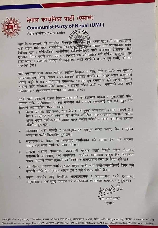 ७ जेठमा संसद् विघटन भयो । सांसदहरूले देउवा प्रधानमन्त्री हुनुपर्ने भन्दै सर्वोच्चमा रिट दायर गरे । १० जेठमा ओलीले देउवालाई प्रधानमन्त्री बनाउने रिटमा हस्ताक्षर गर्ने ११ जनालाई पार्टी सदस्यसमेत नरहने गरी कारबाही गरे । १२ सांसदलाई स्पष्टीकरण सोधे । तर, २३ जेठमा ओलीले पार्टी एकताका लागि भन्दै भएका कारबाही फुकुवा भएको भन्दै अपिल जारी गरेका थिए । उनले जारी गरेको अपिलको पाँचौँ नम्बर बुँदामा भनिएको छ, ‘यसबीचमा विभिन्न कमरेडहरुबाट भएका भएका गल्ती तथा कमिकमजोरीलाई लिएर कुनै कारबाही गरिने छैन र कुनै भेदभाव गरिने छैन ।’