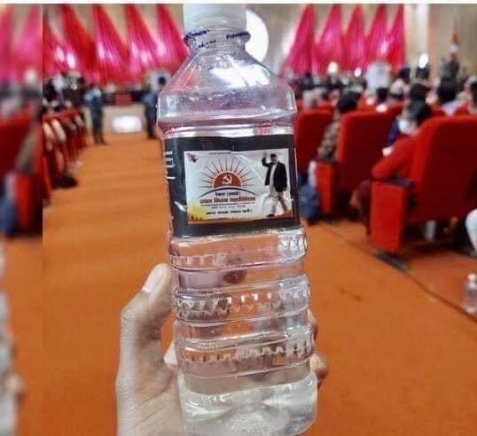 विधान महाधिवेशनमा ओलीको र सूर्य चिन्हको फोटा पानीका बोतलमा पनि छन् । यो एमालेको विधान महाधिवेशनमा ओलीको देबत्वकरणको रुपमा लिएका छन् ।