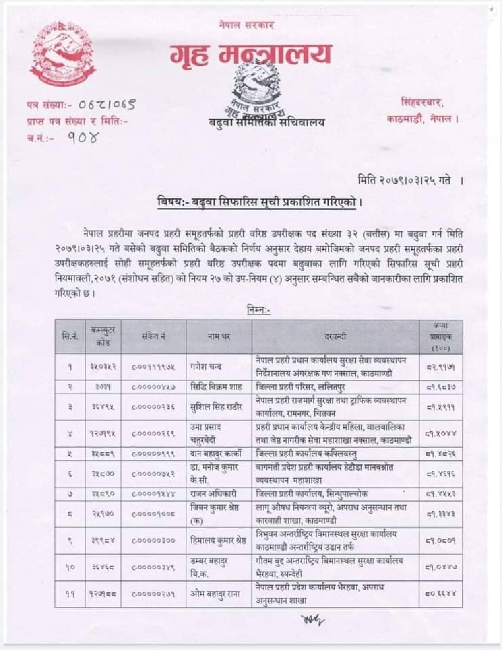 बैठकले प्रहरी नियमावली २०७१ को नियम २४ को उपनियम ४ बमोजिम बढुवाको निर्णय गरेको हो।