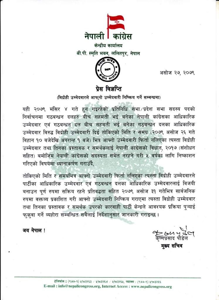 कांग्रेसले बिहीबार विज्ञप्ति जारी गरी सत्ता गठबन्धनविरुद्ध बागी उम्मेदवार बनेकाले ३१ असोजसम्म उम्मेदवारी निस्क्रिय पारे कारबाही फुकुवा गर्ने जनाएको छ । कांग्रेसले बुधबार विज्ञप्ति जारी गरी सत्ता गठबन्धनविरुद्ध बागी उम्मेदवार बन्नेलाई पार्टीबाट ५ वर्षका लागि निष्कासन गरेको बताएको थियो ।