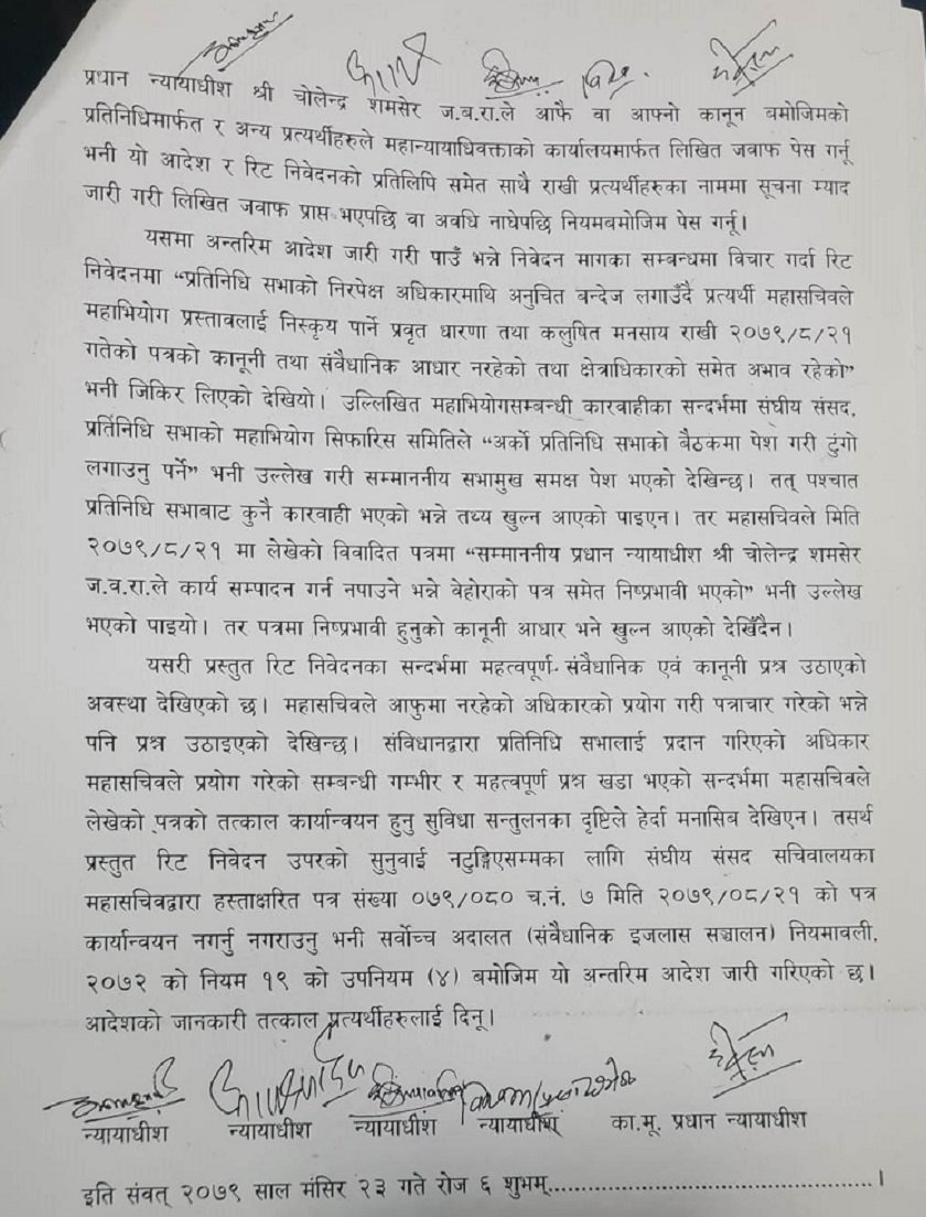 शुक्रबार कायम मुकायम प्रधान न्यायाधीश हरिकृष्ण कार्की तथा न्यायाधीशहरू विश्वम्भरप्रसाद श्रेष्ठ, ईश्वरप्रसाद खतिवडा, डा।आनन्दमोहन भट्टराई र अनिलकुमार सिन्हाको संवैधानिक इजलासले महासचिवको उक्त पत्र तत्काल कार्यन्वयन नगर्न र नगराउन अन्तरिम आदेश जारी गरेको हो । संघीय संसद सचिवालय समेतलाई विपक्षी बनाई दायर गरिएको रिटमा विपक्षीहरुको नाममा बाटाको म्याद बाहेक ७ दिनको समय दिएर लिखित जवाफ पेश गर्न पनि आदेश जारी गरिएको छ ।