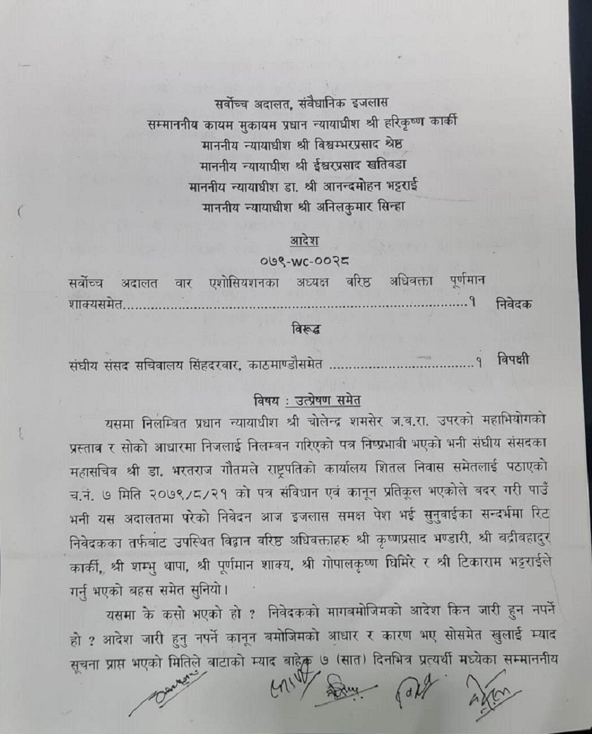 तर आफ्नो अधिकार क्षेत्रभन्दा बाहिर गएर संघीय संसदका महासचिव गौतमले निलम्बनमा नरहेको पत्र जारी गरेको भन्दै उक्त पत्र कार्यान्वयन नगर्न र नगराउन सर्वोच्च अदालत बार एसोसिएसनका अध्यक्ष पूर्णमान शाक्यसहितले अन्तरिम आदेशको मागदावी गर्दै संवैधानिक इजलासमा रिट दर्ता गराएका थिए । बुधबार दर्ता भएको रिट शुक्रबारको संवैधानिक इजलासमा पेशीमा चढेको थियो ।