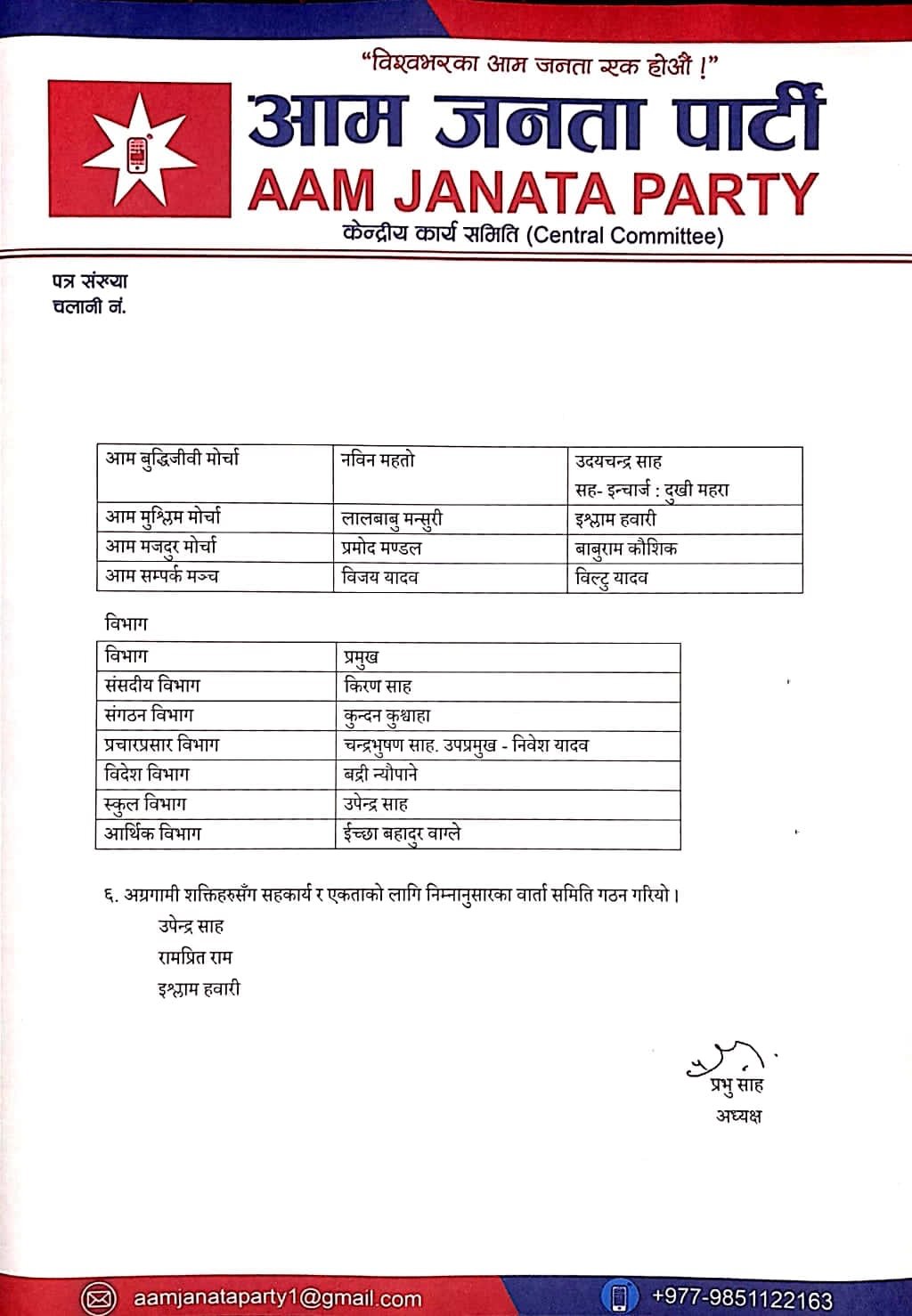 पार्टीको केन्द्रीय कमिटी ५१ सदस्यीय बनाइएको छ । सातै प्रदेश इन्चार्ज र अध्यक्ष चयन गरिएको साहको सचिवालयले जानकारी दिएको छ ।