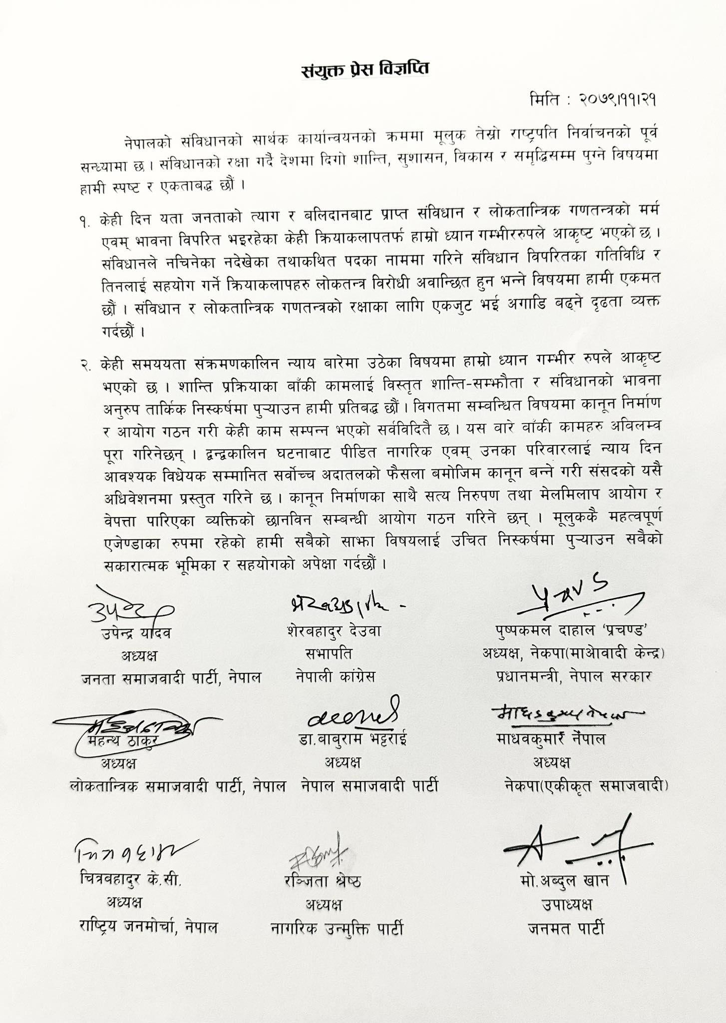 त्यस्तै जसपाका अध्यक्ष उपेन्द्र यादव, लोसपाका अध्यक्ष महन्थ ठाकुर, राष्ट्रिय जनमोर्चाका अध्यक्ष चित्रबहादुर केसी, नागरिक उन्मुक्ति पार्टीकी अध्यक्ष रञ्जिता श्रेष्ठ र जनमत पार्टीका उपाध्यक्ष मो. अब्दुल खानले पनि हस्ताक्षर गरेका छन् ।