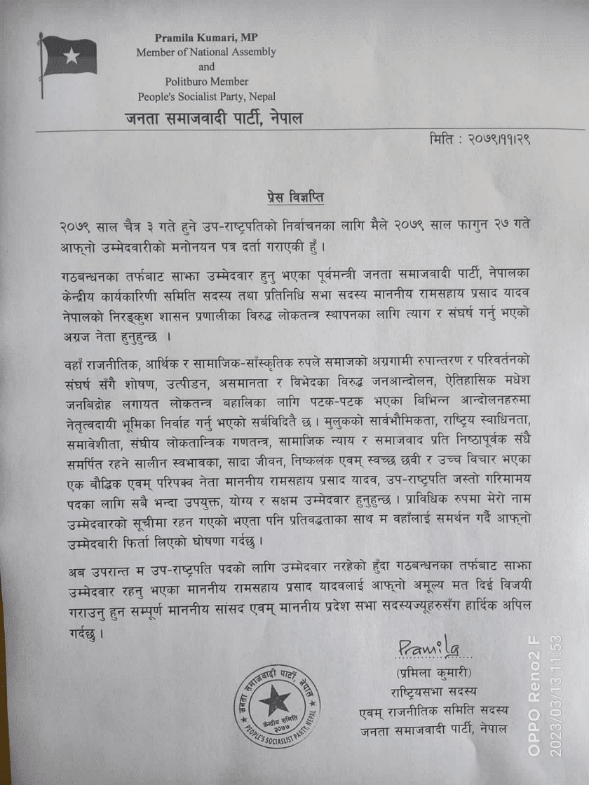 काठमाडौँ । उपराष्ट्रपतिको उम्मेदवार बनेकी प्रमिलाकुमारी यादवले आफ्नो उम्मेदवारी फिर्ता लिएको घोषणा गरेकी छन् । उनी जनता समाजवादी पार्टीको तर्फबाट उम्मेदवार बनेकी थिइन । उनले सोमवार आफ्नै पार्टीका अर्का उम्मेदवार रामसहाय यादवलाई समर्थन गर्दै उम्मेदवारी फिर्ता लिएको विज्ञप्तीमा उल्लेख गरेकी छन् ।