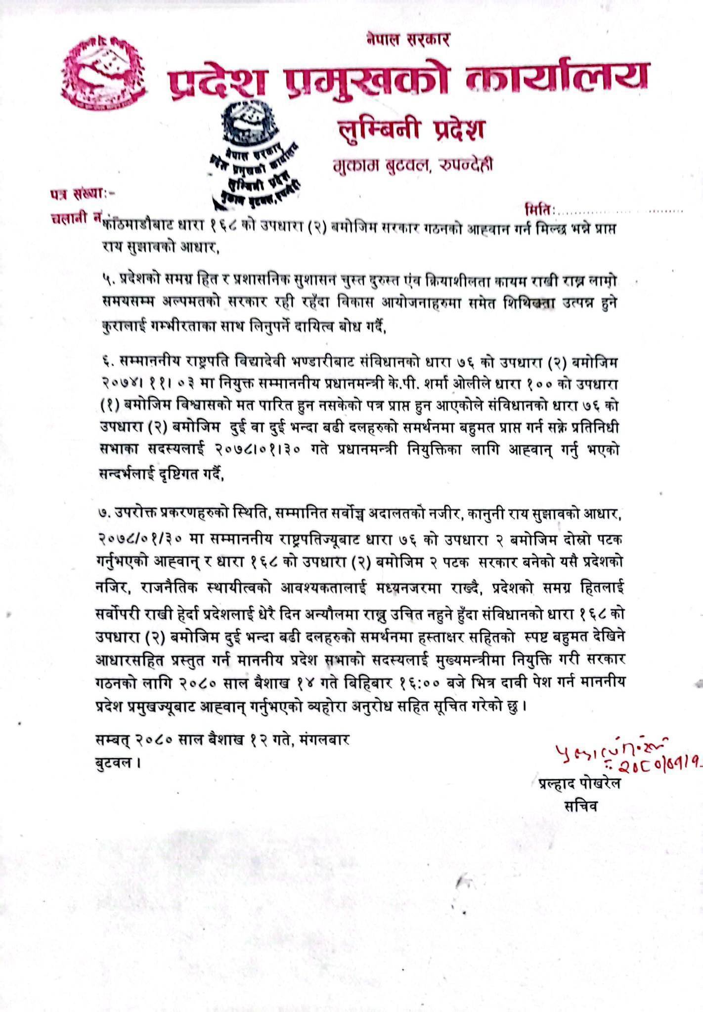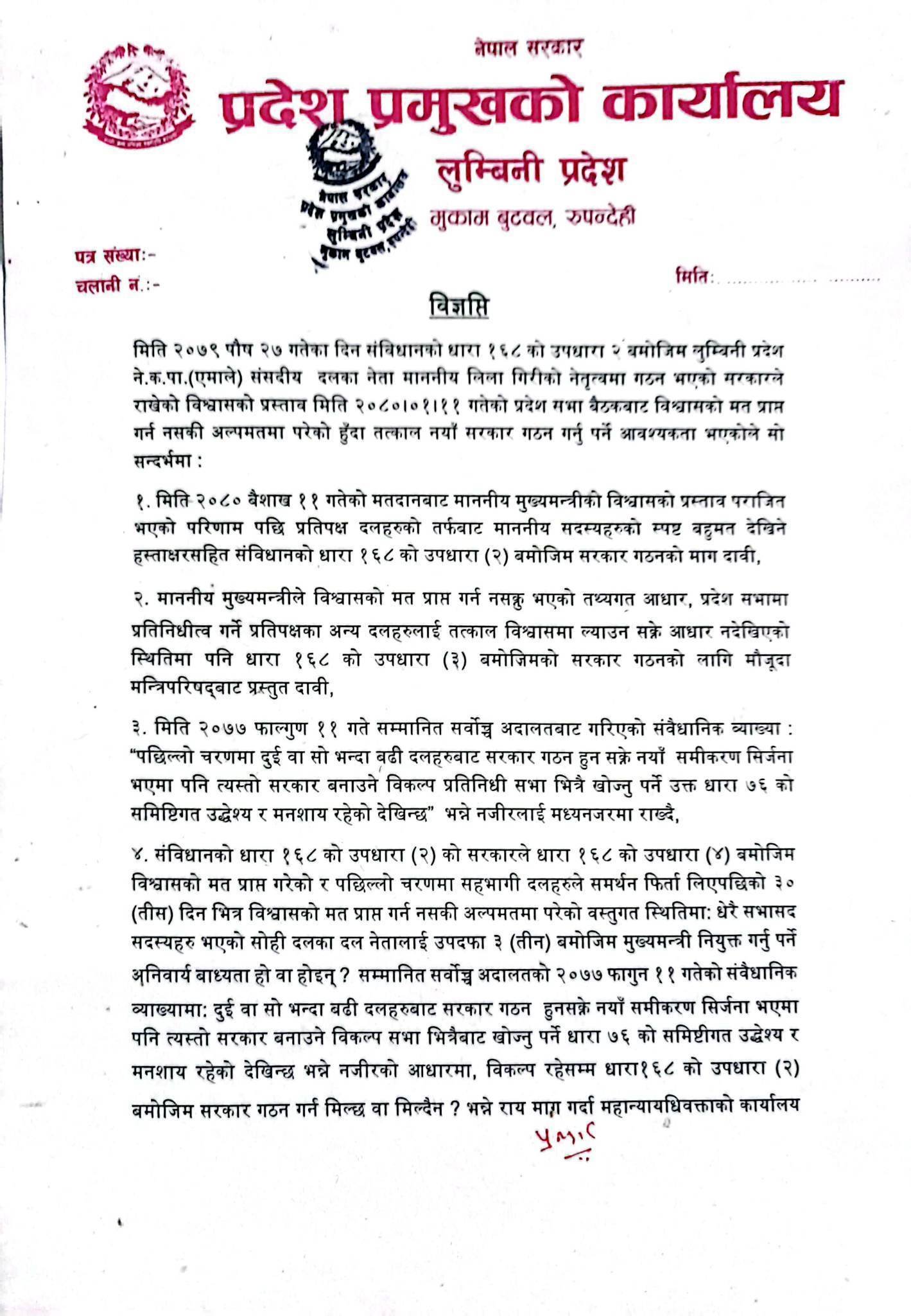 लुम्बिनीमा १६८ (२) बमोजिम सरकार गठन गर्न आह्वान