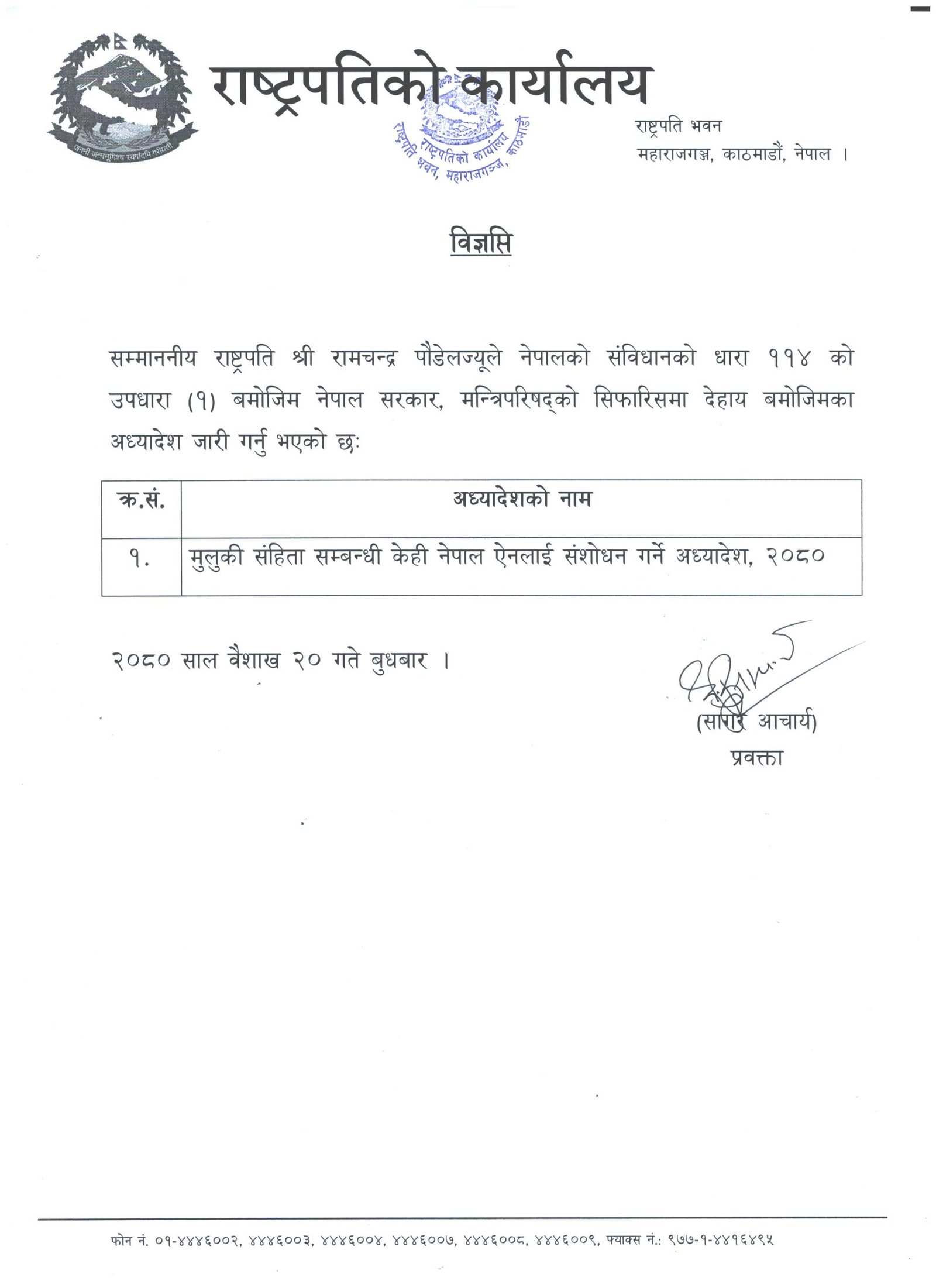 ‘राष्ट्रपति रामचन्द्र पौडेलज्यूले नेपालको संविधानको धारा ११४ को उपधारा १ बमोजिम मन्त्रिपरिषद्को सिफारिसमा मुलुकी संहितासम्बन्धी केही नेपाल ऐनलाई संशोधन गर्ने अध्यादेश, २०८० जारी गर्नु भएको छ, राष्ट्रपति कार्यालयका प्रवक्ता सागर आचार्यले जारी गरेको विज्ञप्ति उल्लेख छ ।