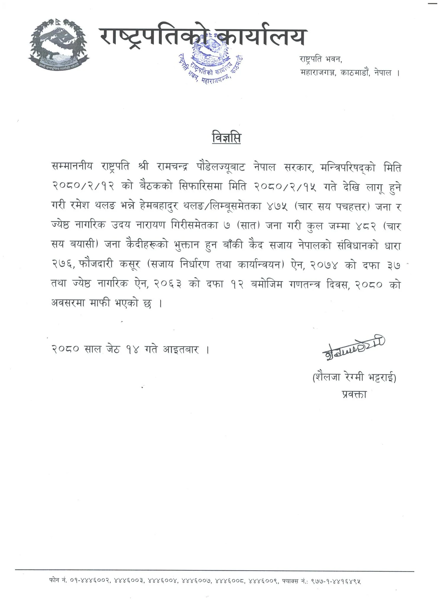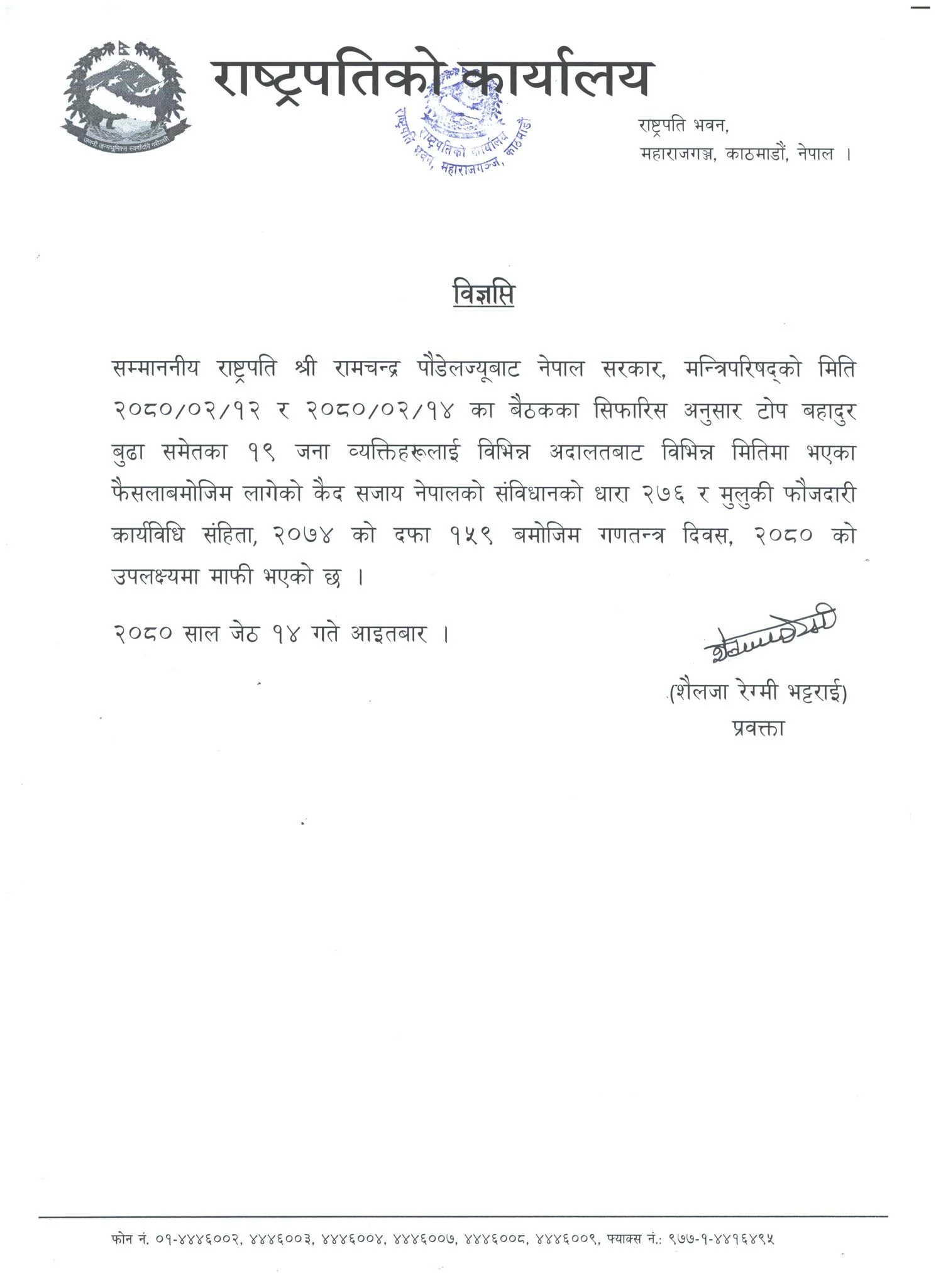 राष्ट्रपति कार्यालयद्वारा जारी विज्ञप्तिमा भनिएको छ, ‘टोपबहादुर बुढा समेतका १९ जना व्यक्तिहरूलाई विभिन्न अदालतबाट विभिन्न मितिमा भएका फैसलाबमोजिम लागेको कैद सजाय नेपालको संविधानको धारा २७६ र मुलुकी फौजदारी कार्यविधि संहिता, २०७४ को दफा १५९ बमोजिम गणतन्त्र दिवस, २०८० को उपलक्ष्यमा माफी भएको छ ।‘