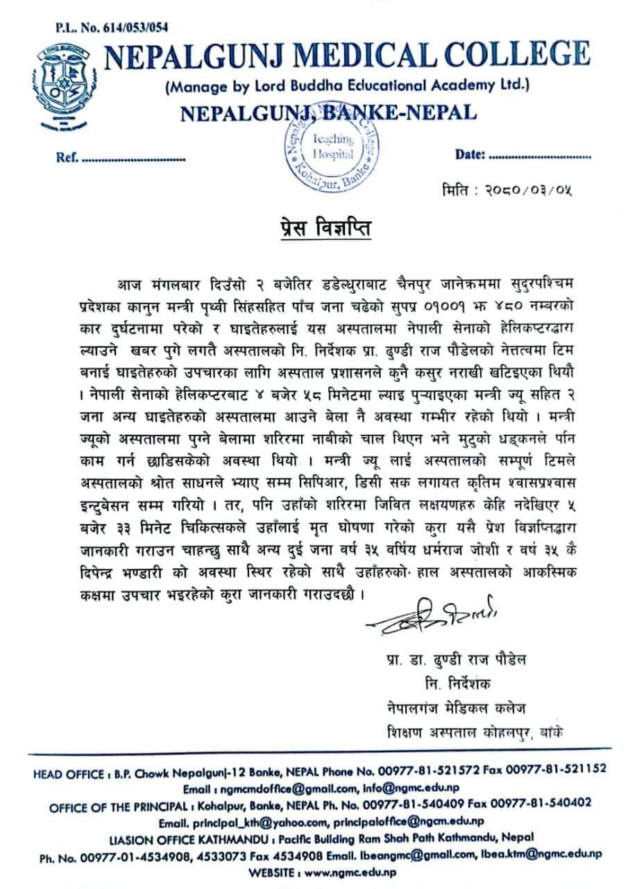 काठमाडौं । सवारी दुर्घटनामा गम्भीर घाइते भएका सुदूरपश्चिम प्रदेशका आन्तरिक मामिला तथा कानुन मन्त्री पृथ्वीबहादुर सिंहको निधन भएको छ । बाँकेस्थित कोहलपुर मेडिकल कलेजमा उपचाका क्रममा उनको निधन भएको हो ।