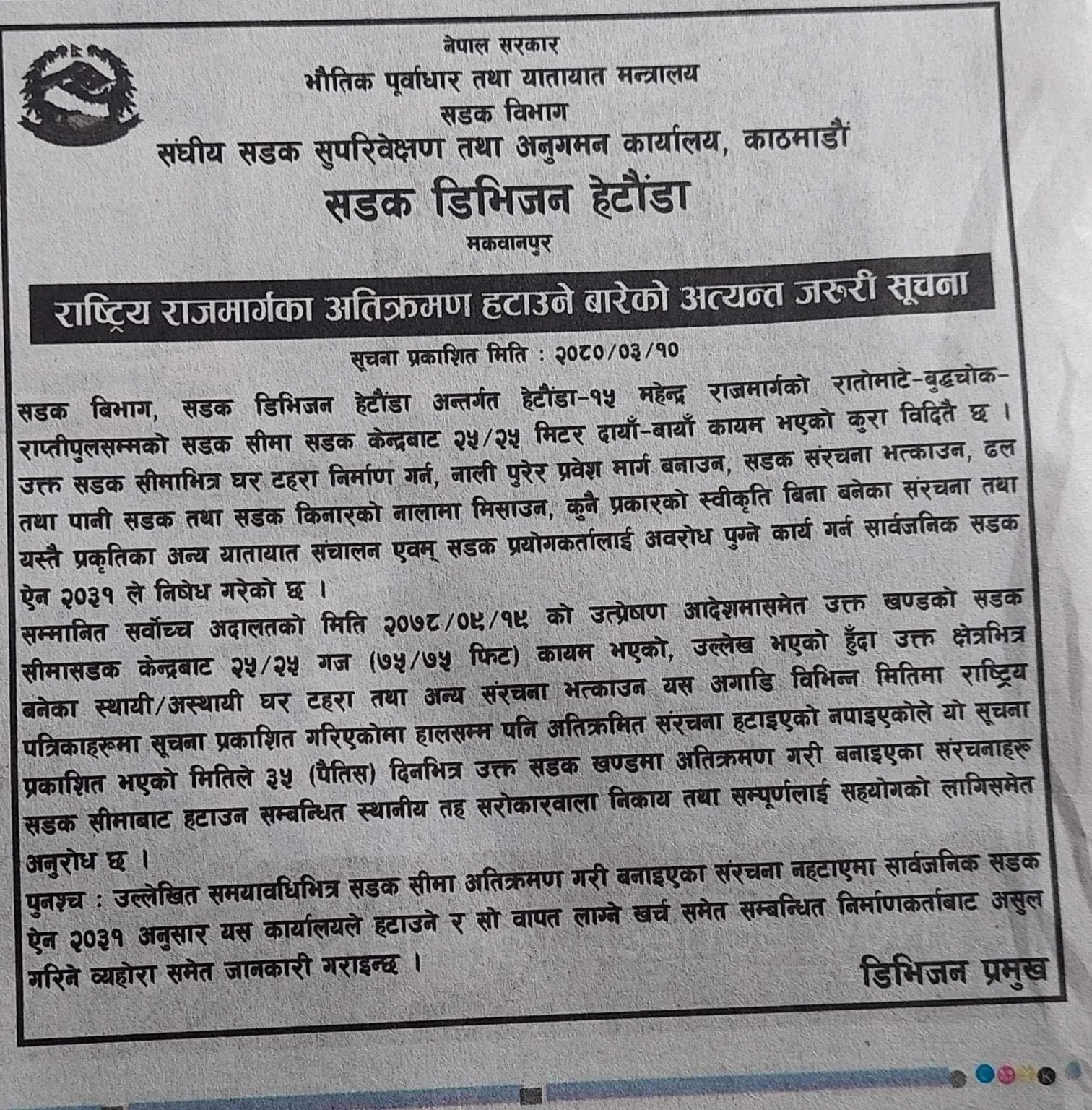 भौतिक पुर्वाधार तथा यातायात मन्त्रालय, सडक विभाग, संघीय सडक सुपरिवेक्षण तथा अनुगमनको कार्यलय काठमाडौं, सडक डिभिजन हेटौंडाले ३५ दिने सूचना जारीगर्दै दायाँ बाँयाको २५ मिटर खालि गर्न सूचना जारी गरेको हो ।