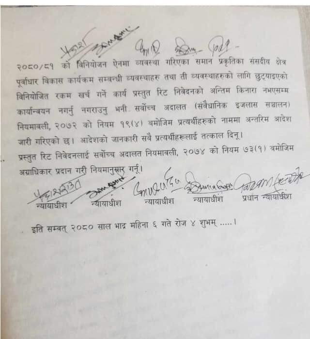 ‘नेपालको संविधानको शब्द, भाव र मर्म समेतलाई दृष्टगत गर्दा विनियोजन ऐन, २०८० को रुपमा पारित आर्थिक वर्ष २०८०र८१ को बजेट वक्तव्यको बुँदा नम्बर ४४५ सँग सम्बन्धित व्यवस्था र सातवटै प्रदेशका व्यवस्थापिकाहरुको आर्थिक वर्ष २०८०र८१ को विनियोजन ऐनमा व्यवस्था गरिएका समान प्रकृतिका संसदीय क्षेत्र पूर्वाधार विकास कार्यक्रमसम्बन्धी व्यवस्थाहरू तथा ती व्यवस्थाहरूको लागि छुट्याइएको विनियोजित रकम खर्च गर्ने कार्य प्रस्तुत रिट निवेदनको अन्तिम किनारा नभएसम्म कार्यान्वयन नगर्नु नगराउनू’ आदेशमा भनिएको छ ।
