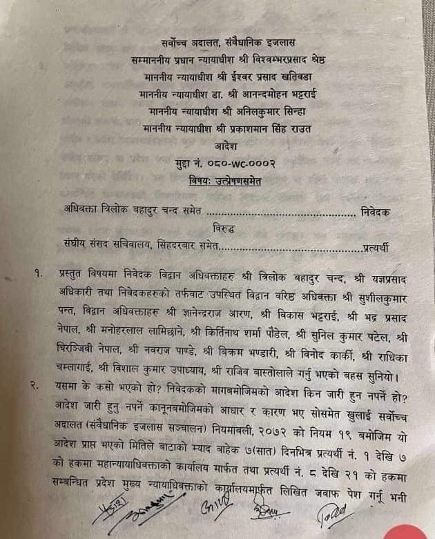 उक्त रिटमा सुनुवाइ गर्दै सर्वोच्च अदालतको संवैधानिक इजलासले बुधबार उक्त आदेश दिएको हो । सर्वोच्च अदालतका प्रधानन्यायाधीश विश्वम्भरप्रसाद श्रेष्ठ, न्यायाधीशहरू ईश्वरप्रसाद खतिवडा, डा. आन्दमोदन भट्टराई, अनिलकुमार सिन्हा र प्रकाशमान सिंह राउतको संवैधानिक इजलासमा बुधबार उक्त रिटको सुनुवाइ भएको थियो ।
