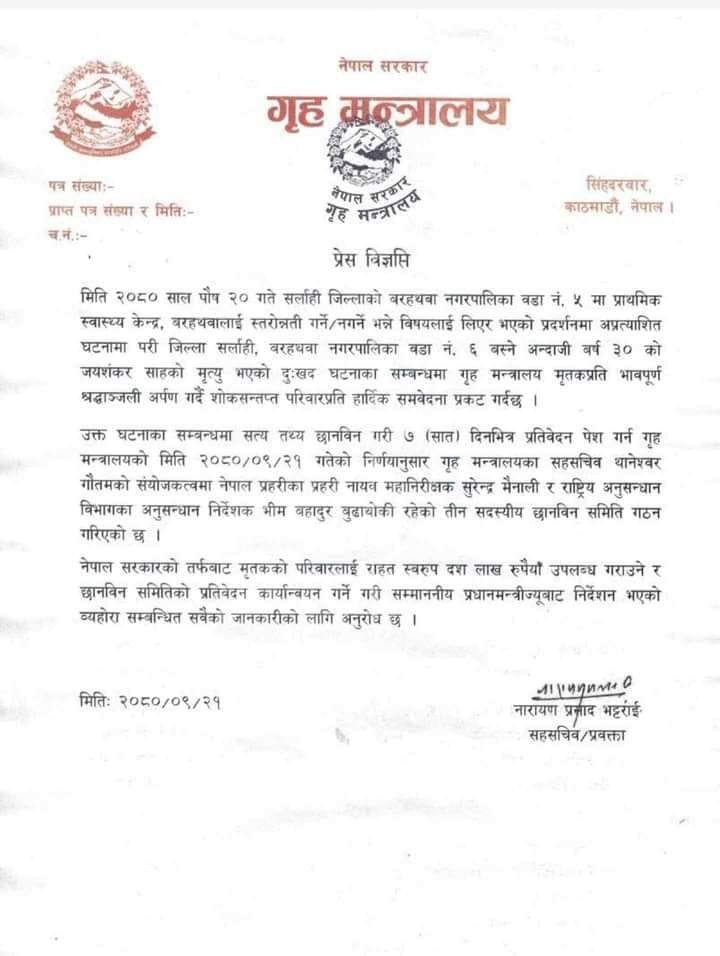 बरहथवाका मृतक साहका परिवारलाई १० लाख दिने निर्णय, गृहले बनायो छानबिन समिति