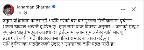 उपमहासचिव शर्माले सामाजिक सञ्जालमा लेखेका छन्, ‘रुकुमपश्चिमबाट काठमाडौँ आउँदै गरेको बस बागलुङको निसीखोलामा दुर्घटना भएको खबरले अत्यन्तै दुःखित छु । हालसम्म प्राप्त विवरण अनुसार ७ जनाको मृत्यु र २५ जना घाइते भएको अवस्था छ । दुर्घटनामा ज्यान गुमाउनेहरूप्रति भावपूर्ण श्रद्धाञ्जली अर्पण गर्दै परिवारजनमा गहिरो समवेदना व्यक्त गर्दछु ।