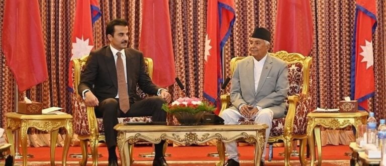 काठमाडौँ । राष्ट्रपति रामचन्द्र पौडेल र कतारका अमिर (राजा) शेख तमिम बिन हमाद अल थानीबिच राष्ट्रपति भवन शीतल निवासमा द्विपक्षीय भेटवार्ता भएको छ ।