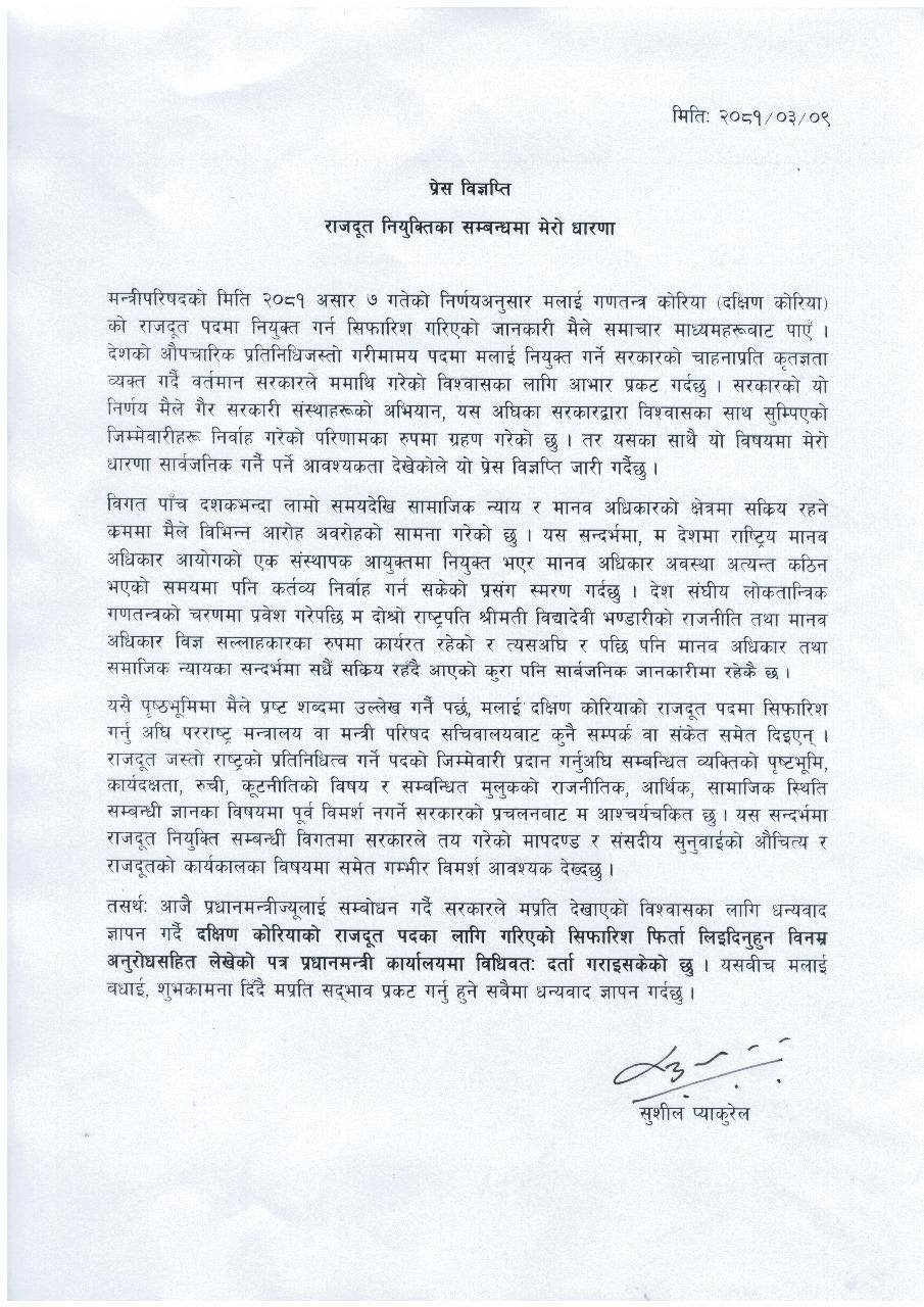 असार ७ गतेको मन्त्रिपरिषद्को निर्णयअनुसार आफूलाई दक्षिण कोरियाको राजदूत पदमा नियुक्त गर्न सिफारिस गरिएको जानकारी सञ्चारमाध्यममार्फत पाएको पनि उनको विज्ञप्तिमा उल्लेख छ ।