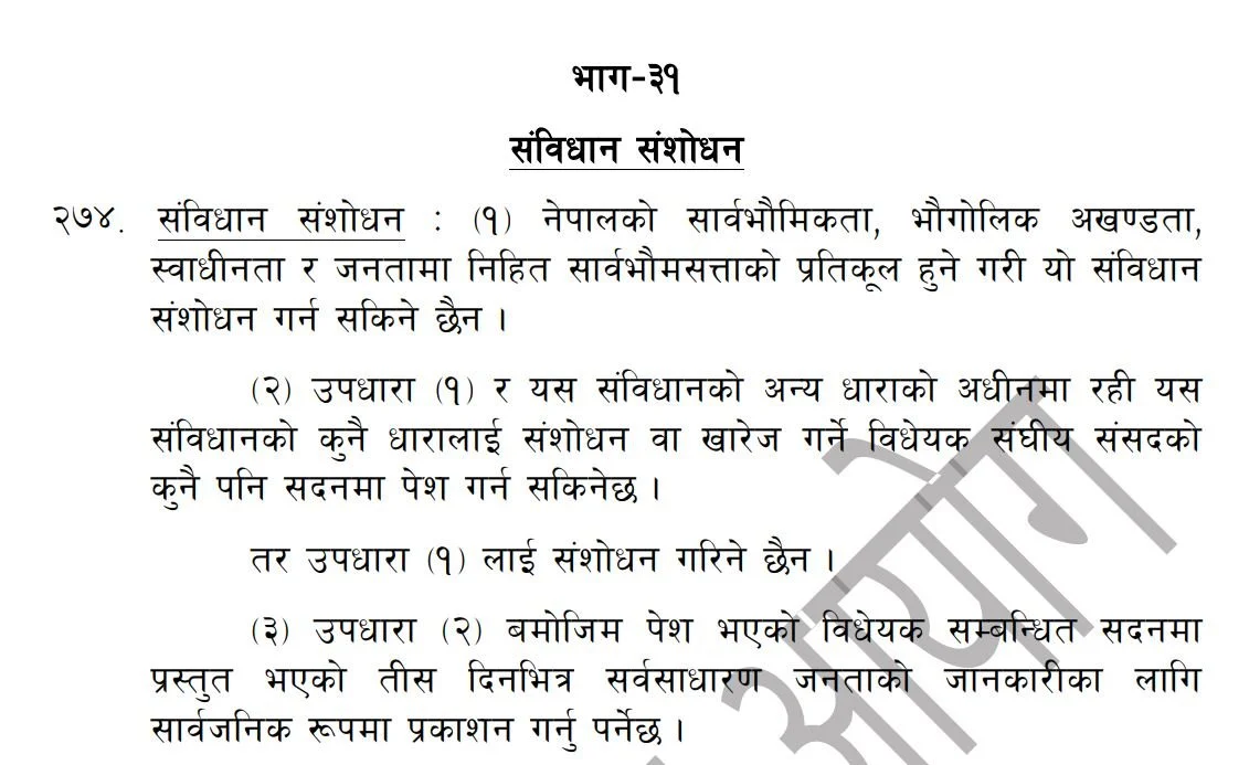 संविधानको धारा २७४ मा संविधान संशोधनबारे उल्लेख छ । उक्त धाराको उपधारा (१) मा नेपालको सार्वभौमिकता, भौगोलिक अखण्डता, स्वाधीनता र जनतामा निहित सार्वभौमसत्ताको प्रतिकूल हुने गरी यो संविधान संशोधन गर्न सकिने छैन भन्ने उल्लेख छ ।