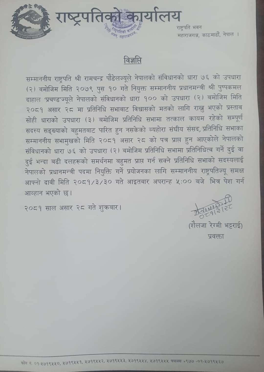 राष्ट्रपति कार्यालयका प्रवक्ता शैलजा रेग्मी भट्टराईद्वारा जारी विज्ञप्तिमा भनिएको छ, ‘२०७९ पुस १० गते नियुक्त सम्माननीय प्रधानमन्त्री श्री पुष्पकमल दाहाल प्रचण्डज्यूले नेपालको संविधानको धारा १०० को उपधारा (२) बमोजिम मिति २०८१ असार २८ मा प्रतिनिधि सभाबाट विश्वासको मतका लागि राख्नुभएको प्रस्ताव सोही धाराको उपधारा (३) बमोजिम प्रतिनिधि सभामा तत्काल कायम रहेको सम्पूर्ण सदस्य संख्याको बहुमतबाट पारित हुन नसकेको व्यहोरा संघीय संसद, प्रतिनिधि सभाका सम्माननीय सभामुखको मिति २०८१ असार २८ को पत्र प्राप्त हुन आएकाले नेपालको संविधानको धारा ७६ को उपधारा (२) बमोजिम प्रतिनिधि सभामा प्रतिनिधित्व गर्ने दुई वा दुईभन्दा बढी दलहरूको समर्थनमा बहुमत प्राप्त गर्न सक्ने प्रतिनिधि सभाको सदस्यलाई नेपालको प्रधानमन्त्री पदमा नियुक्ति गर्ने प्रयोजनका लागि सम्माननीय राष्ट्रपतिज्यू समक्ष आफ्नो दाबी मिति २०८१।३।३० गते आइतबार अपराह्न ५ः०० बजे भित्र पेस गर्न आह्वान भएको छ।’