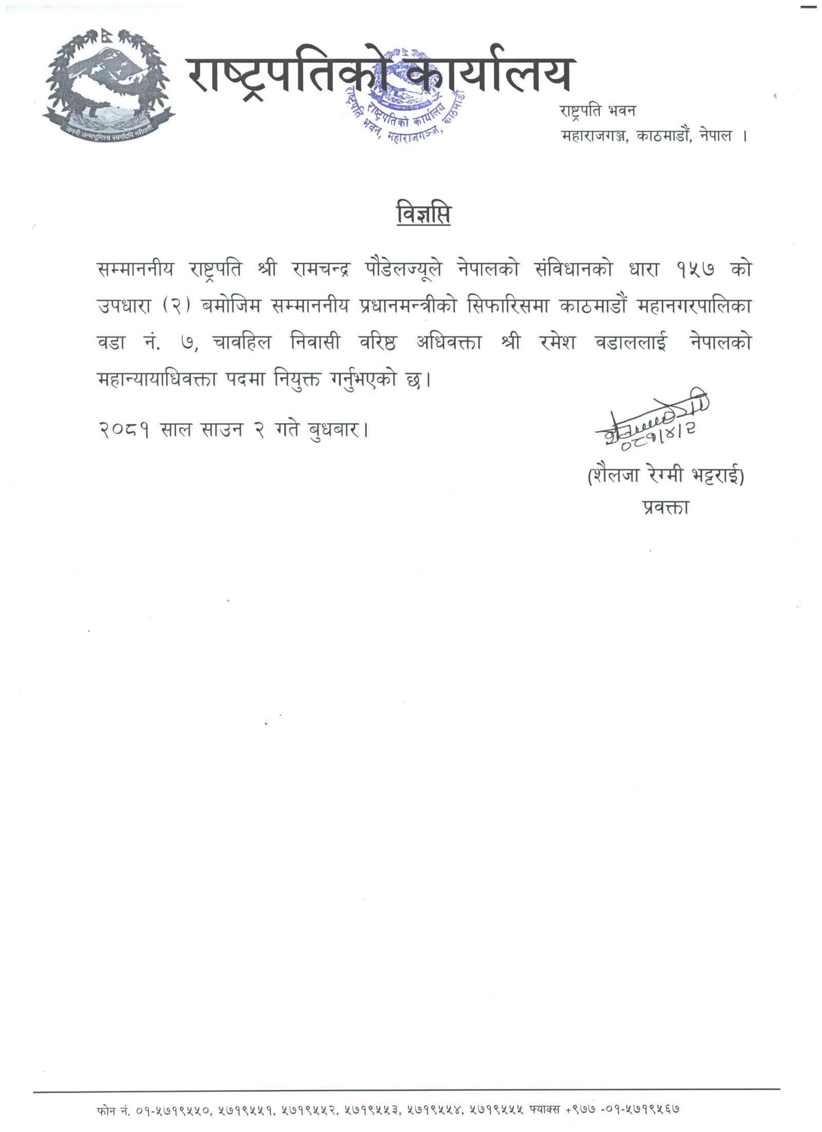 काठमाडौं । रमेश बडाल महान्यायाधिवक्तामा नियुक्त भएका छन् । प्रधानमन्त्री केपी शर्मा ओलीको सिफारिसमा राष्ट्रपति रामचन्द्र पौडेलले उनलाई महान्यायाधिवक्ता नियुक्त गरेका हुन् । बडाल यसअघि पनि ओली प्रधानमन्त्री हुँदा महान्यायाधिवक्ता बनेका थिए ।