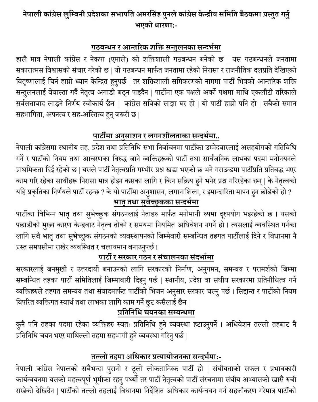 ‘संघीयता एवं समावेशिताको मर्म र पार्टीको विधान ९नेपाली कांग्रेसको संशोधित विधान, २०१७ को परिच्छेद ४ दफा १३ को ७ (ठ) अनुसार प्रदेश पार्टीको अन्तरसम्बन्ध, अन्तरसमन्वय र सहअस्तित्वमा सरकार गठन गर्नुपर्ने प्रावधानलाई कुल्चिदै नेपाली जनतामा संघीयता र प्रदेश संरचनाप्रति वितृष्णा पैदा भैरहेको बेला कांग्रेसका आम साथीहरूको भावना विपरीत यस किसिमको निरङ्कुश कार्यशैलीले पार्टीको प्रदेश संरचना कमजोर बन्ने ठहर छ,’ उनले भने, ‘तसर्थ उक्त निर्णयलाई पुनर्विचार गर्न कांग्रेस केन्द्रीय नेतृत्वलाई हार्दिक आग्रह गर्छु ।’
