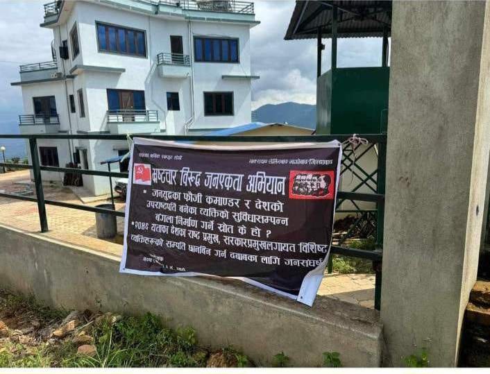 भ्रष्टाचारविरुद्ध अभियान चलाउने भन्दै पूर्वउपराष्ट्रपति पुनको घरमा नेकपा बहुमतको कालो ब्यानर