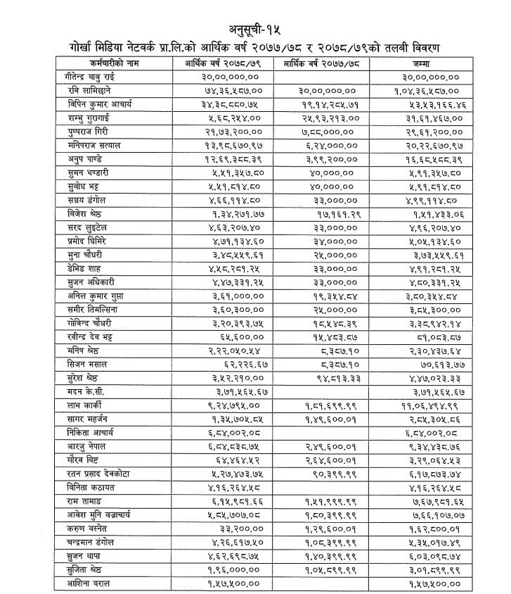 उनले दुई आर्थिक वर्षमा गरी कुल १ करोड ४ लाख ३६ हजार रुपैयाँ तलबका रूपमा बुझेको प्रतिवेदनमा उल्लेख छ । लामिछाने १ माघ २०७७ देखि १ असार २०७९ सम्म गोर्खा मिडियामा आबद्ध थिए ।