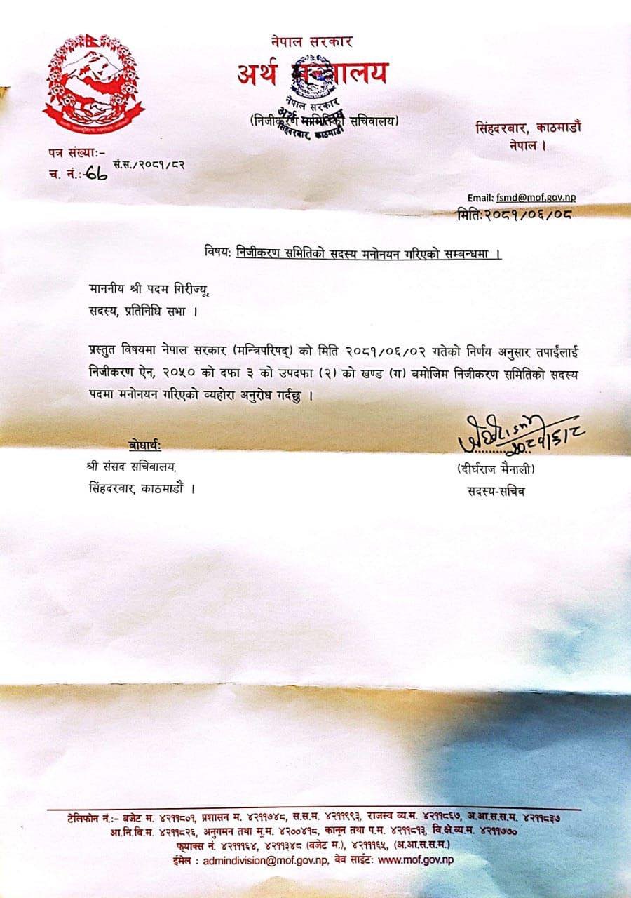काठमाडौं । प्रतिनिधि सभा सदस्य पदम गिरी निजीकरण समितिको सदस्यमा मनोनीत भएका छन् ।