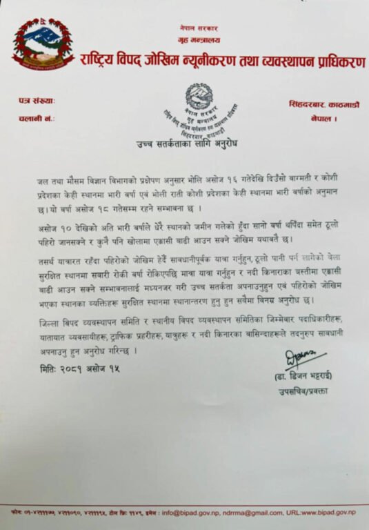 पहिरो तथा बाढीको जोखीम हेरेर सुरक्षित हुँदै यात्रा गर्न उसले आग्रह गरेको छ ।