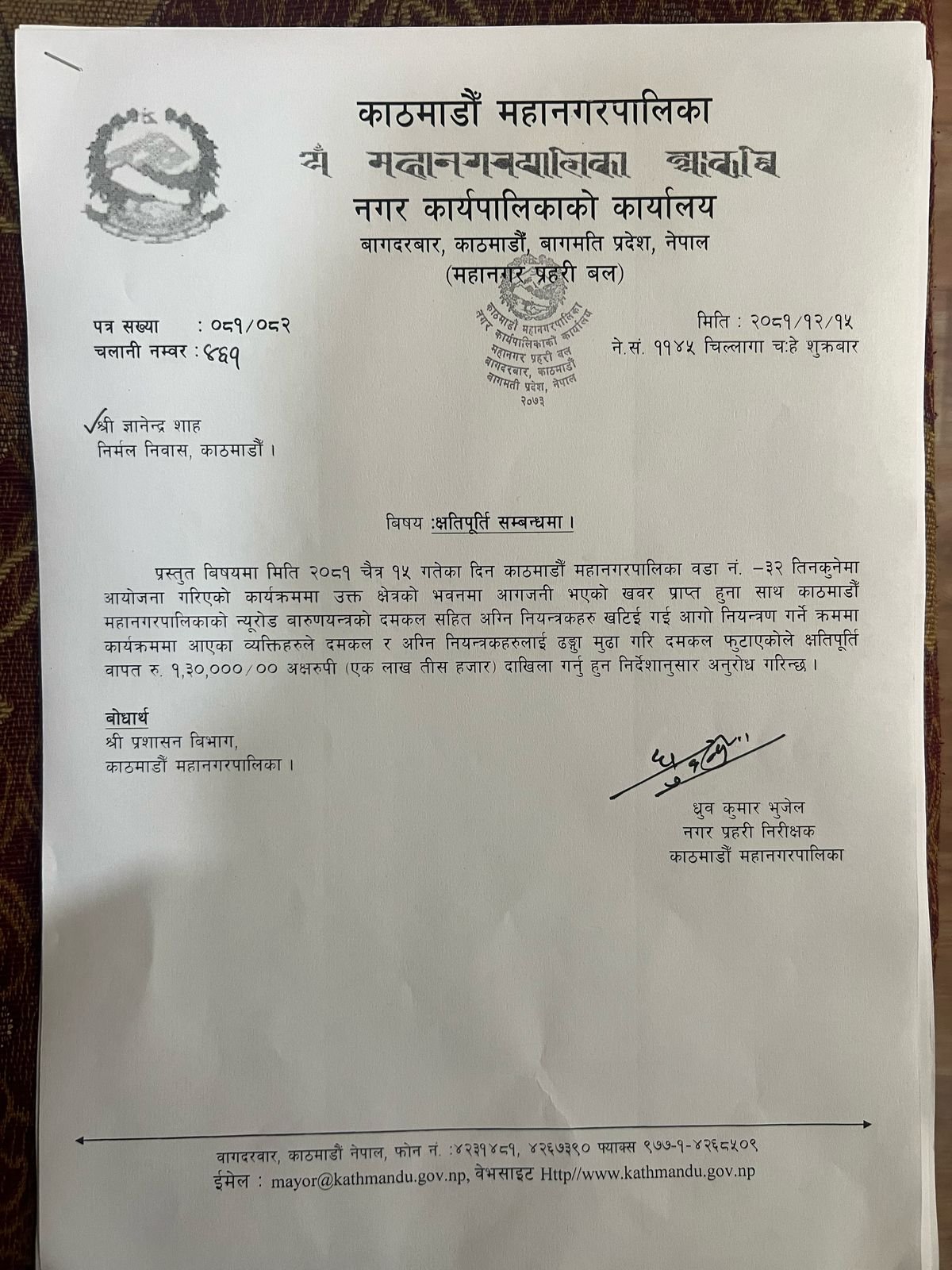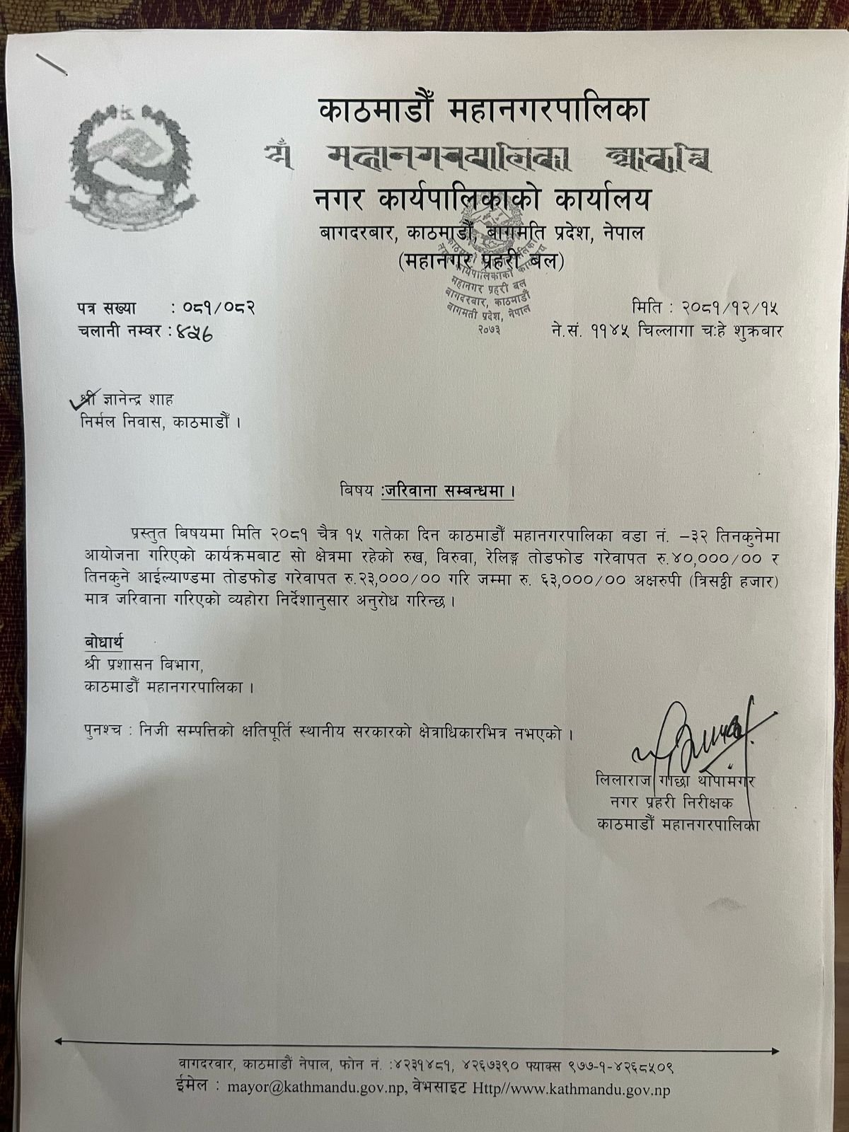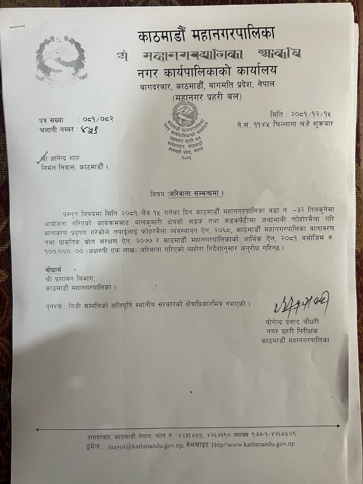 महानगरपालिकाले शाहलाई ८ वटा पत्र काटेको छ । शाहको सहमतिमा शुक्रबार राजवादीले राजधानीको तीनकुने क्षेत्रमा प्रदर्शन गरेकामा फोहोरमैला गरेको लगायतका कारण देखाउँदै जरिवाना र क्षतिपूर्ति माग गर्दै पत्र काटेको हो ।
