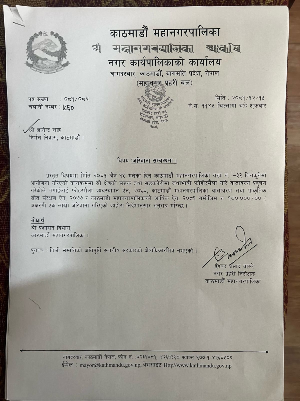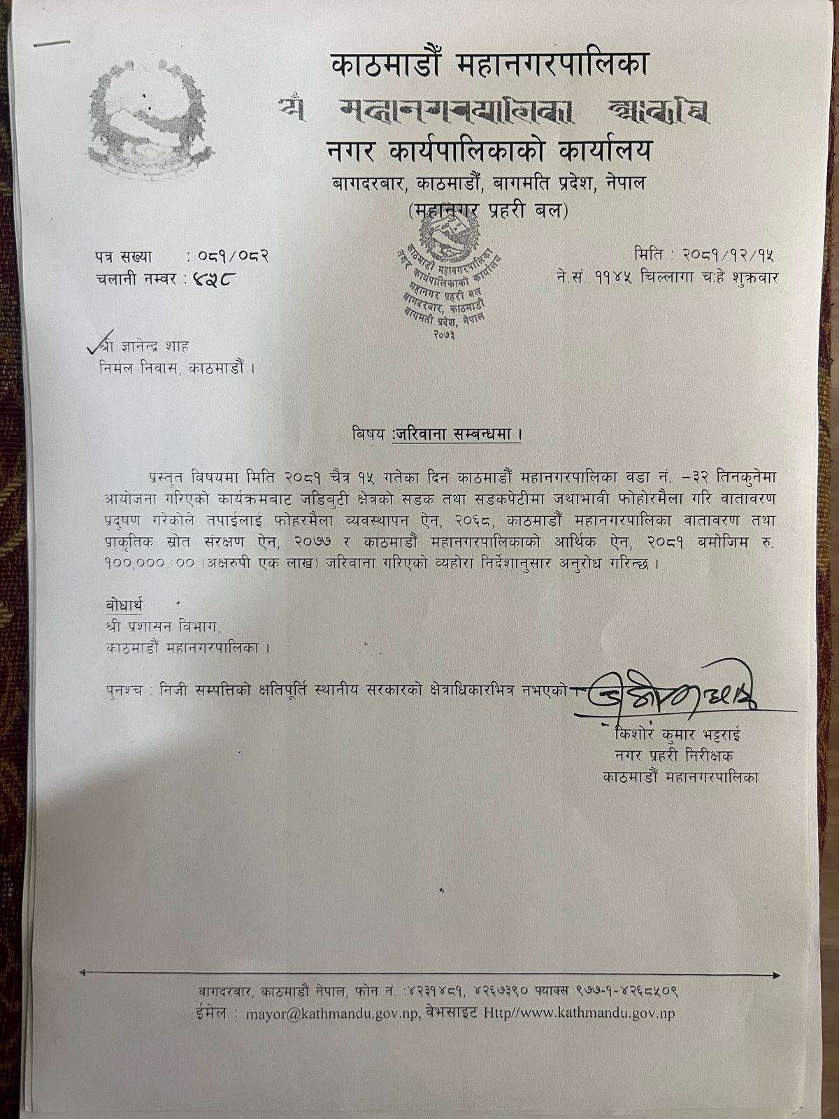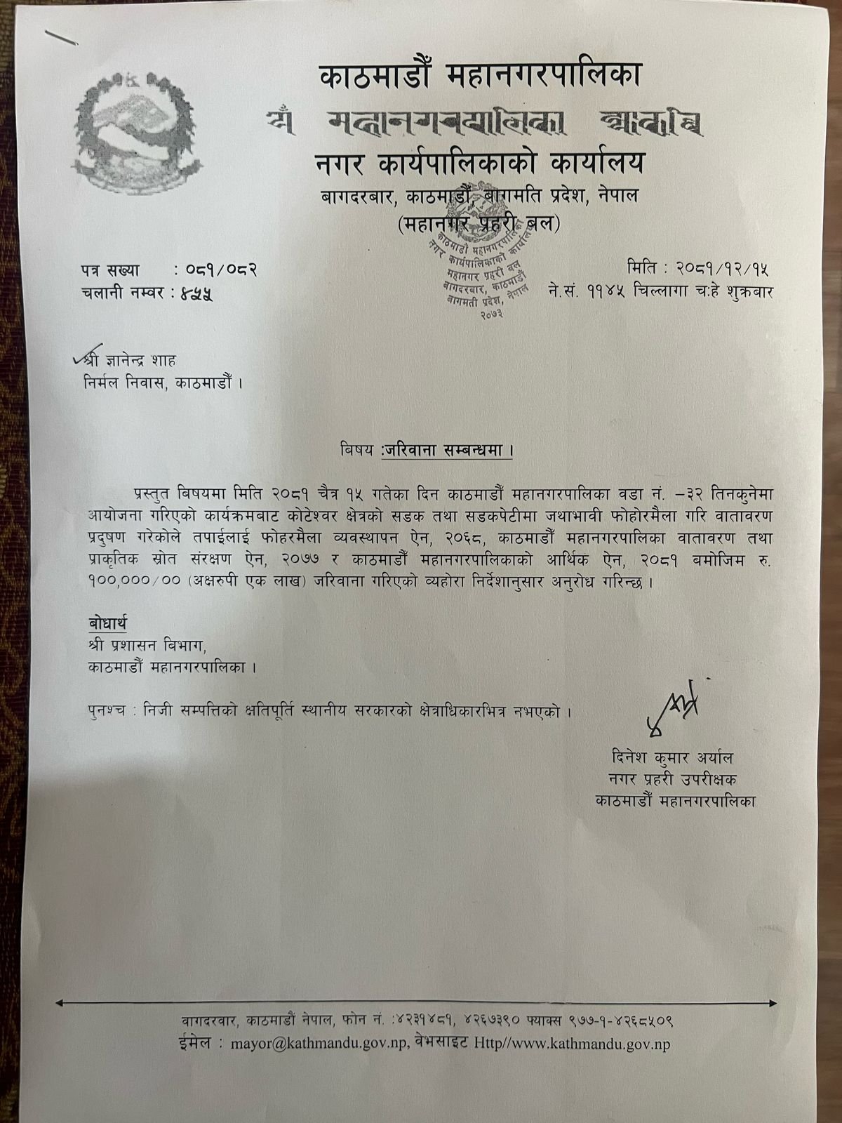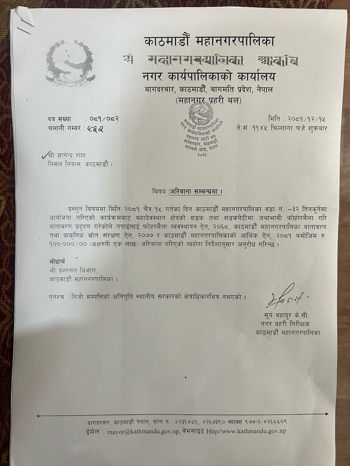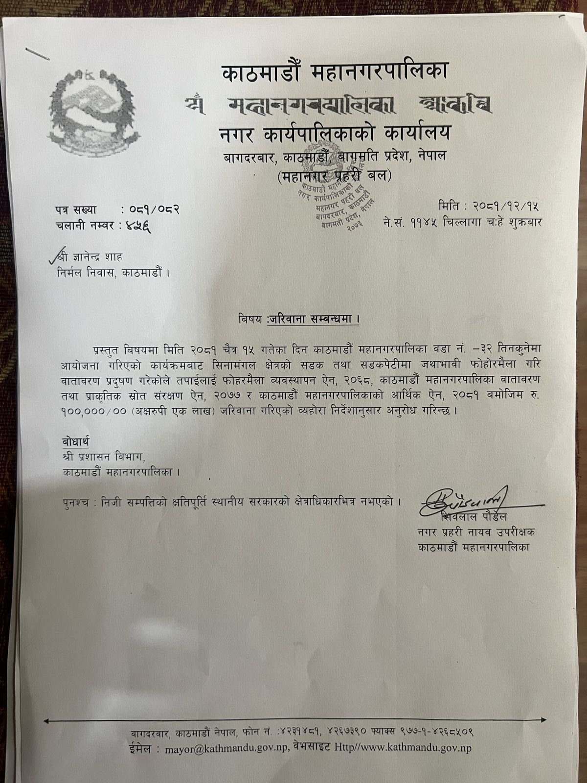 बालेन साहले ८ लाख बराबरको जरिवाना गरेर ज्ञानेन्द्र शाहलाई काट्यो पत्र