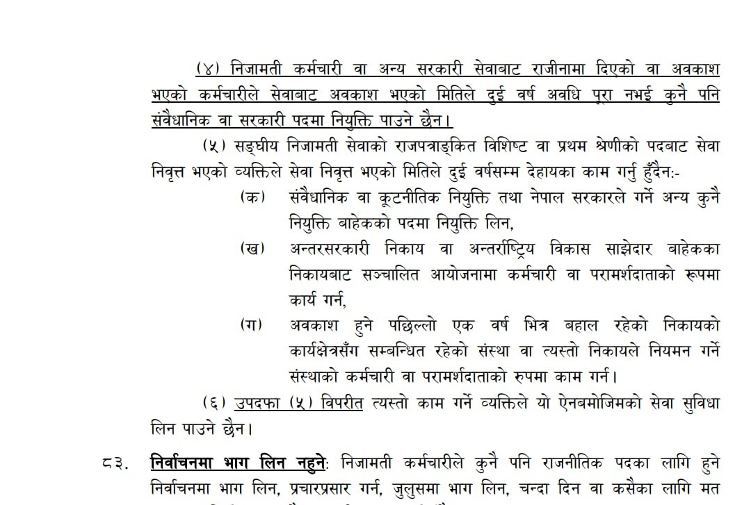उपदफा ४ ले सचिव र सहसचिवका लागि २ वर्ष अन्यत्र काम गर्न रोक लगाउने व्यवस्था गरेको छ । तर, उपदफा ५ को क र ख बुँदाले उनीहरूका लागि संवैधानिक र राजदूत पद खुला गरेको हो । उपदफा ५ को क बुँदामा संवैधानिक वा कूटनीतिक नियुक्ति तथा नेपाल सरकारले गर्ने अन्य नियुक्तिबाहेकको पदमा नियुक्ति लिन नपाउनेु उल्लेख छ ।