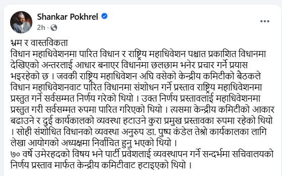सामाजिक सञ्जालमा लेख्दै महासचिव पोखरेलले महाधिवेशनमा पारित विधान र राष्ट्रिय महाधिवेशन पश्चात प्रकाशित विधानमा देखिएको अन्तरलाई आधार बनाएर विधानमा भइरहेको छलछाम भनेर गरिएको प्रचारप्रति पोखरेलले आपत्ती प्रकट गरेका छन् ।