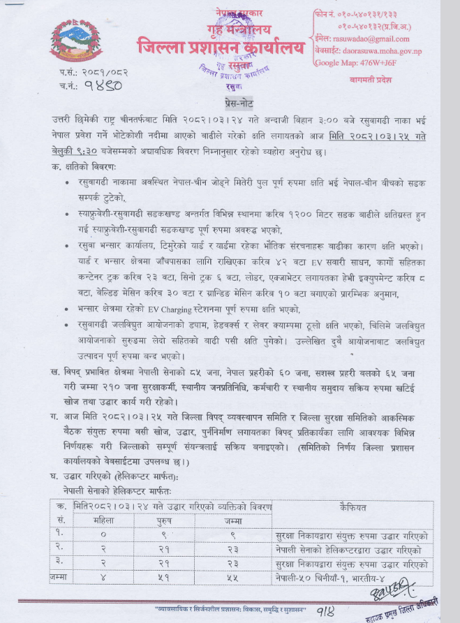 बाढीमा अझै २ प्रहरी, ६ चिनियाँ नागरिक र ११ नेपाली बेपत्ता छन्।