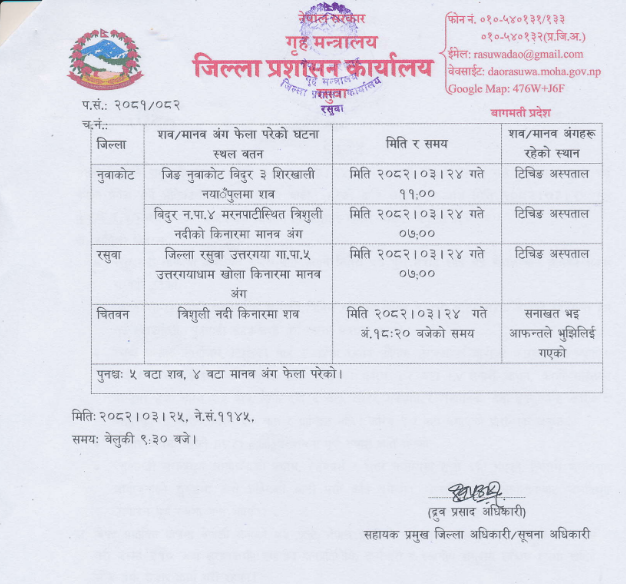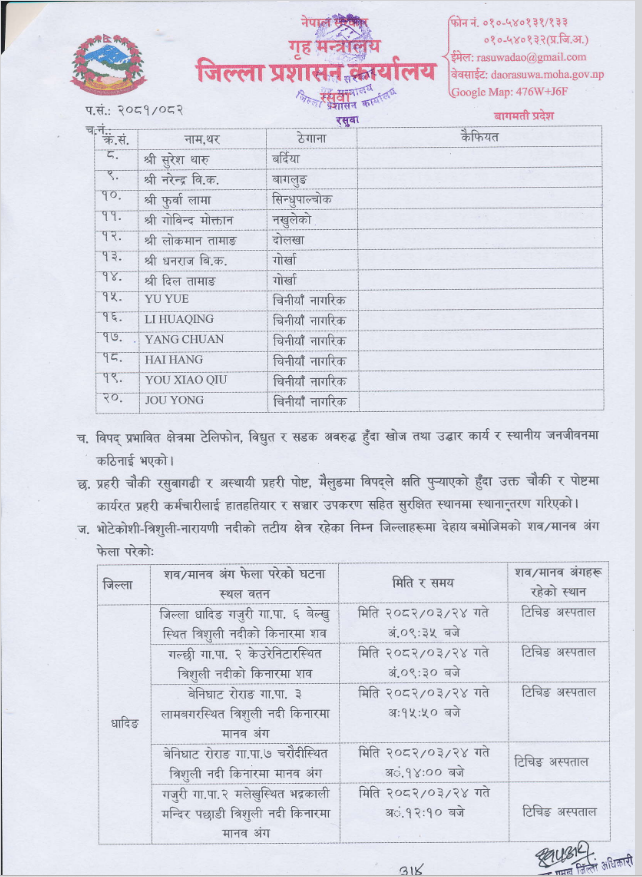 सबै शव तथा मानव अंग काठमाडौँको महाराजगन्जस्थित त्रिवि शिक्षण अस्पतालमा राखिएको रसुवाका सहायक प्रमुख जिल्ला अधिकारी अधिकारीले जानकारी दिए।