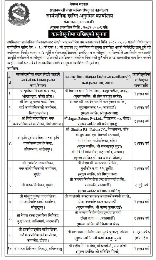 त्यसैगरि काश्यप निर्माण सेवा एण्ड सप्लायर्स दुई वर्षका लागि, मष्टा भवानी निर्माण सेवा डेढ वर्षका लागि कालोसूचीमा परेका छन्। अरु सबै एक वर्षका लागि कालोसूचीमा परेका सूचनामा उल्लेख छ।