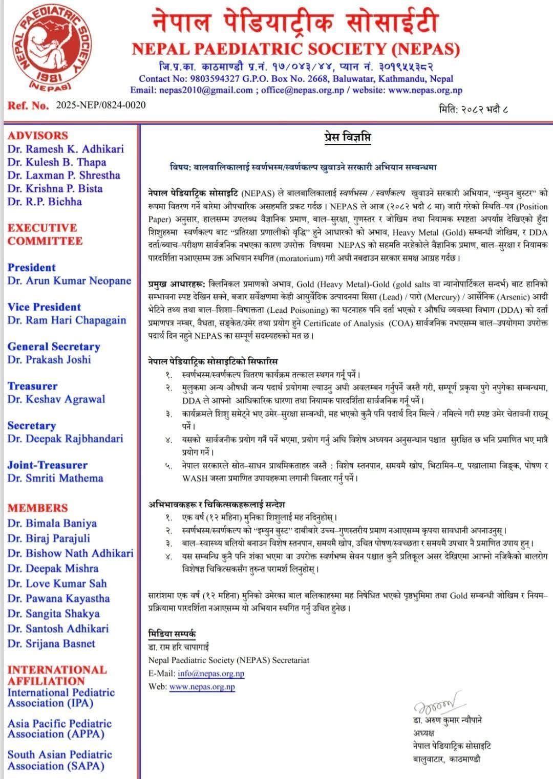 अध्यक्ष डा अरुण कुमार न्यौपानेको हस्ताक्षरमा सोसाइटीले विज्ञप्ति जारी गर्दै सोसाइटीले हालसम्म उपलब्ध वैज्ञानिक प्रमाण, बाल सुरक्षा, गुणस्तर, जोखिम मूल्याङ्कन र नियामक स्पष्टतामा कमी रहेको कारण अभियान तत्काल रोक्न आग्रह गरेको छ।