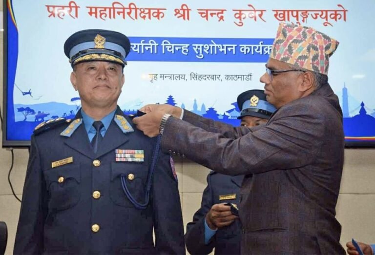 काठमाडौं । नेपाल प्रहरीका नवनियुक्त महानिरीक्षक चन्द्रकुवेर खापुङले आज दर्ज्यानी चिह्न लगाएका छन् । १३ भदौमा बसेको मन्त्रिपरिषद बैठकले उनलाई १९ भदौदेखि लागू हुने गरी नेपाल प्रहरीको महानिरीक्षक नियुक्त गर्ने निर्णय गरेको थियो ।