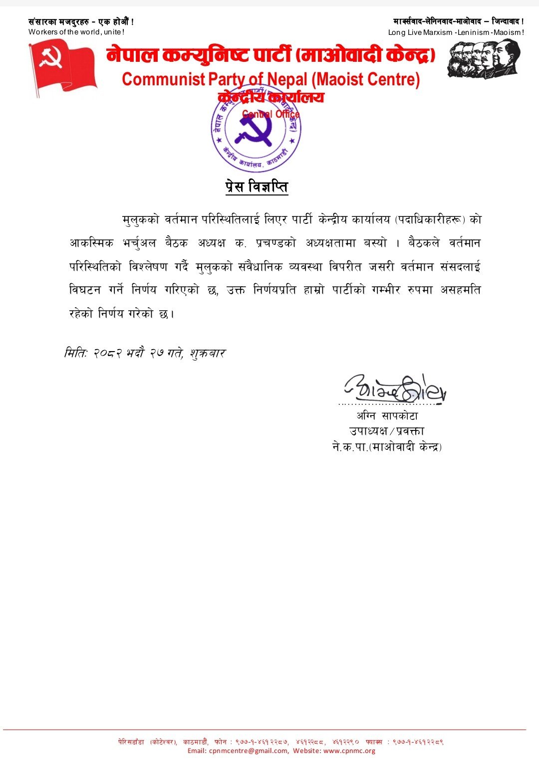 शुक्रबार बसेको माओवादी पदाधिकारीको भर्चुअल बैठकले संवस विघटन गर्ने निर्णयमा गम्भीर असहमति प्रकट गर्ने निर्णय गरेको पार्टी प्रवक्ता अग्नि सापकोटाले विज्ञप्ति जारी गरेर जानकारी दिएका छन् ।