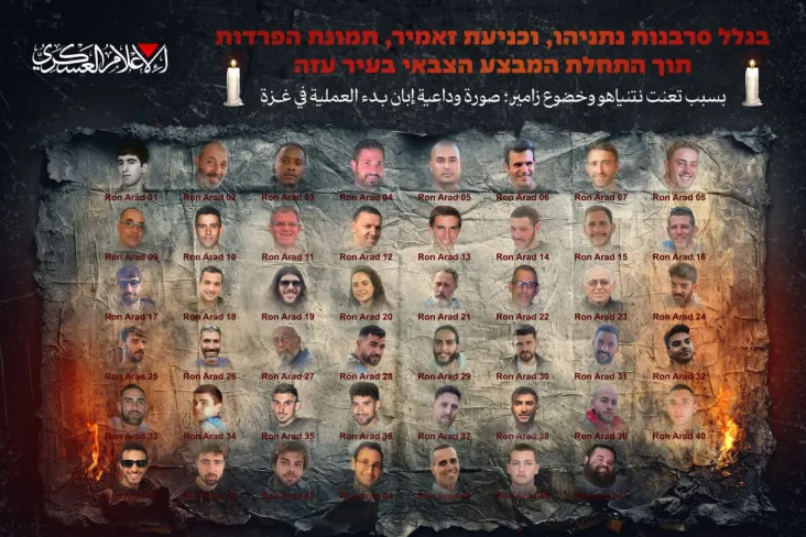 काठमाडौं । इजरायलले गाजालाई घेरेर कब्जा गर्ने भन्दै सैन्य कारबाही बढाएपछि प्लालेस्टाइनी विद्रोही समूह हमासको सशस्त्र शाखा कासाम ब्रिगेड्सले ४८ बन्धकहरूको तस्वीर सार्वजनिक गरेको छ । अलजजिराका अनुसार हालै सार्वजनिक गरिएको उक्त तस्वीरको क्याप्सनमा बिदाइ तस्वीर लेखिएको छ ।