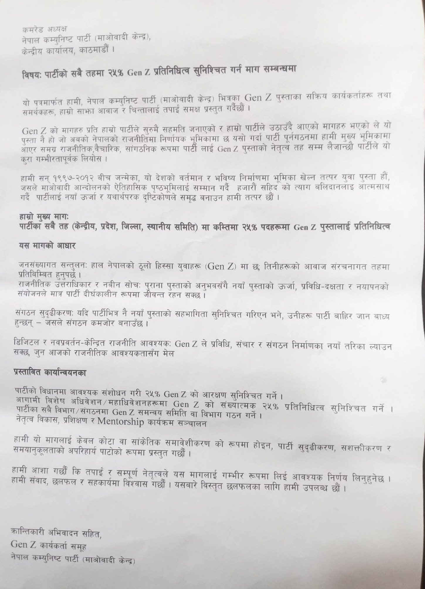 पार्टीका सबै तह (केन्द्रीय, प्रदेश, जिल्ला, स्थानीय समिति) मा २५ प्रतिशत सदस्यहरु जेनजी पुस्तालाई प्रतिनिधित्व गराउनु पर्ने माग गरेको छ । ज्ञापन पत्रमा भनिएको छ , ‘जेन जी को मागहरु प्रत िहाम्रो पार्टीले सुरुमै सहमति जनाएको र हाम्रो पार्टीले उठादै आएको मागहरु भएकाले यो पुस्ता नै हो जो अबको नेपालको राजनीतिमा निर्णायक भूमिकामा छ । यसो गर्दा पार्टी गुर्नगठनमा हामी मुख्य भूमिकामा आएर समग्र राजनीतिक ,वैचारीक, सांगठनिक रुपमा पार्टीलाई जेन जी पुस्ताको नेतृत्व तहसम्म लैजान्छौँ पार्टीले यो कुरा गम्भीरतापूर्वक लिइयोस ।’