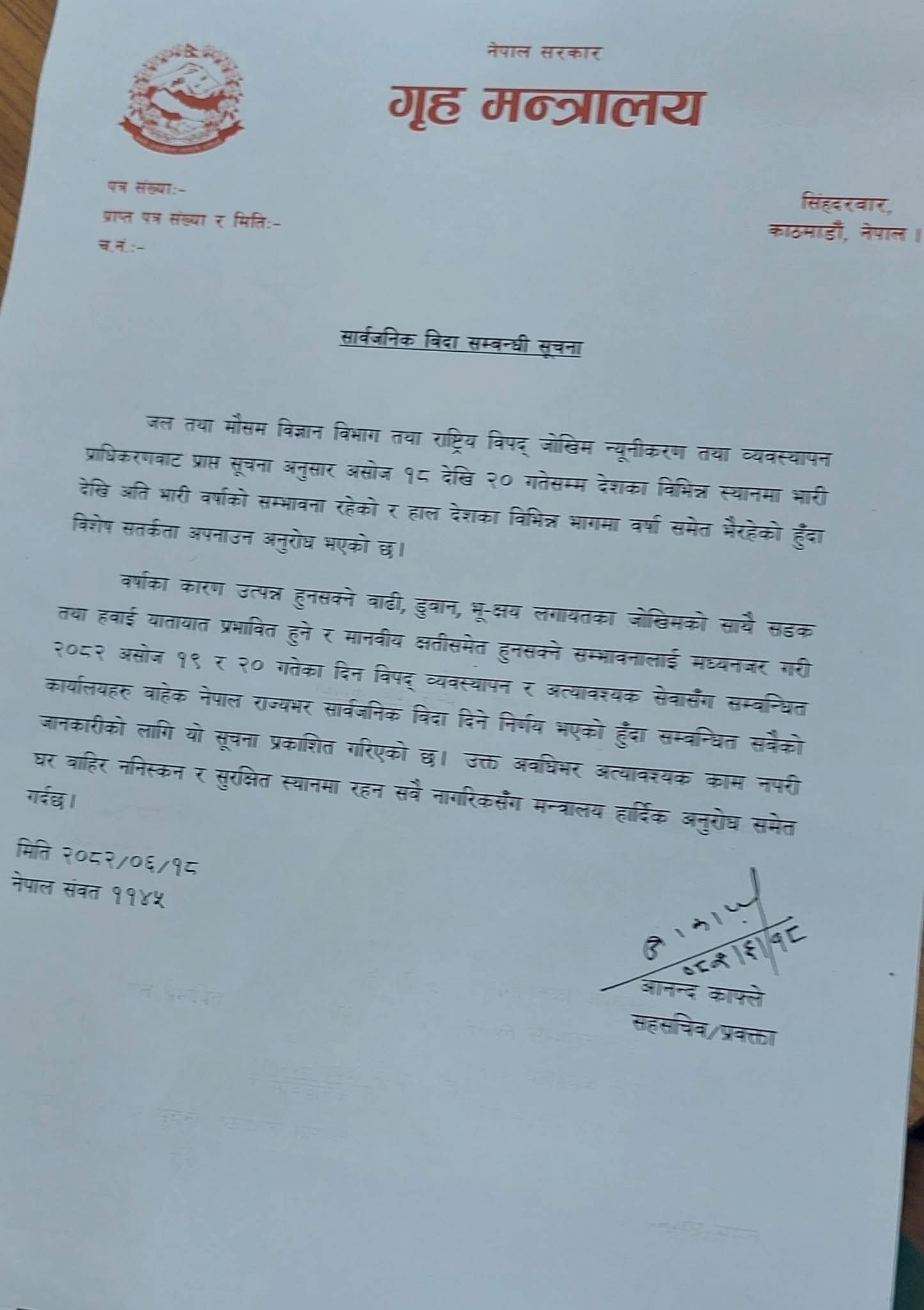 मन्त्रालयका सहसचिव तथा प्रवक्ता आनन्द काफ्लेले जारी गरेको सूचनामा भनिएको छ, ‘२०८२ असोज १९ र २० गतेका दिन विपद् व्यवस्थापन र अत्यावश्यक सेवासँग सम्बन्धित कार्यालयहरू बाहेक नेपालभरका सबै कार्यालय, संस्था र निकायमा सार्वजनिक बिदा रहनेछ।’