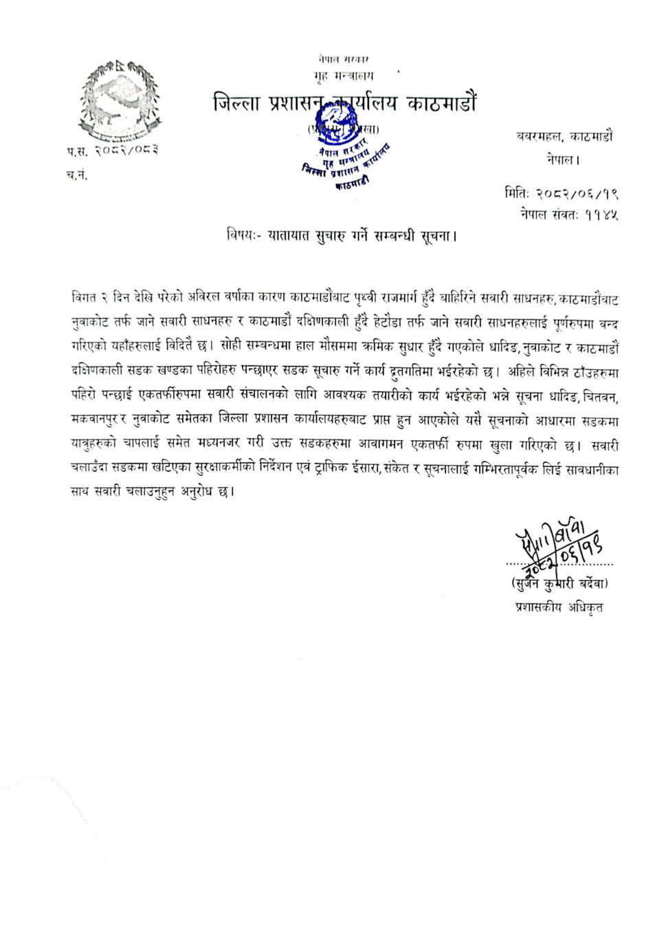 जिल्ला प्रशासन कार्यालय काठमाडौंले एक सूचना जारी गर्दै विभिन्न ठाँउमा पहिरो पन्छाएर एकतर्फीरुपमा सवारी सञ्चालनको तयारी भइरहेकाले धादिङ, चितवन, मकवानपुर र नुवाकोट प्रशासनको सूचनाका आधारमा ती जिल्लामा आवागमन एकतर्फी रूपमा खुला गरिएको जनाएको हो ।
